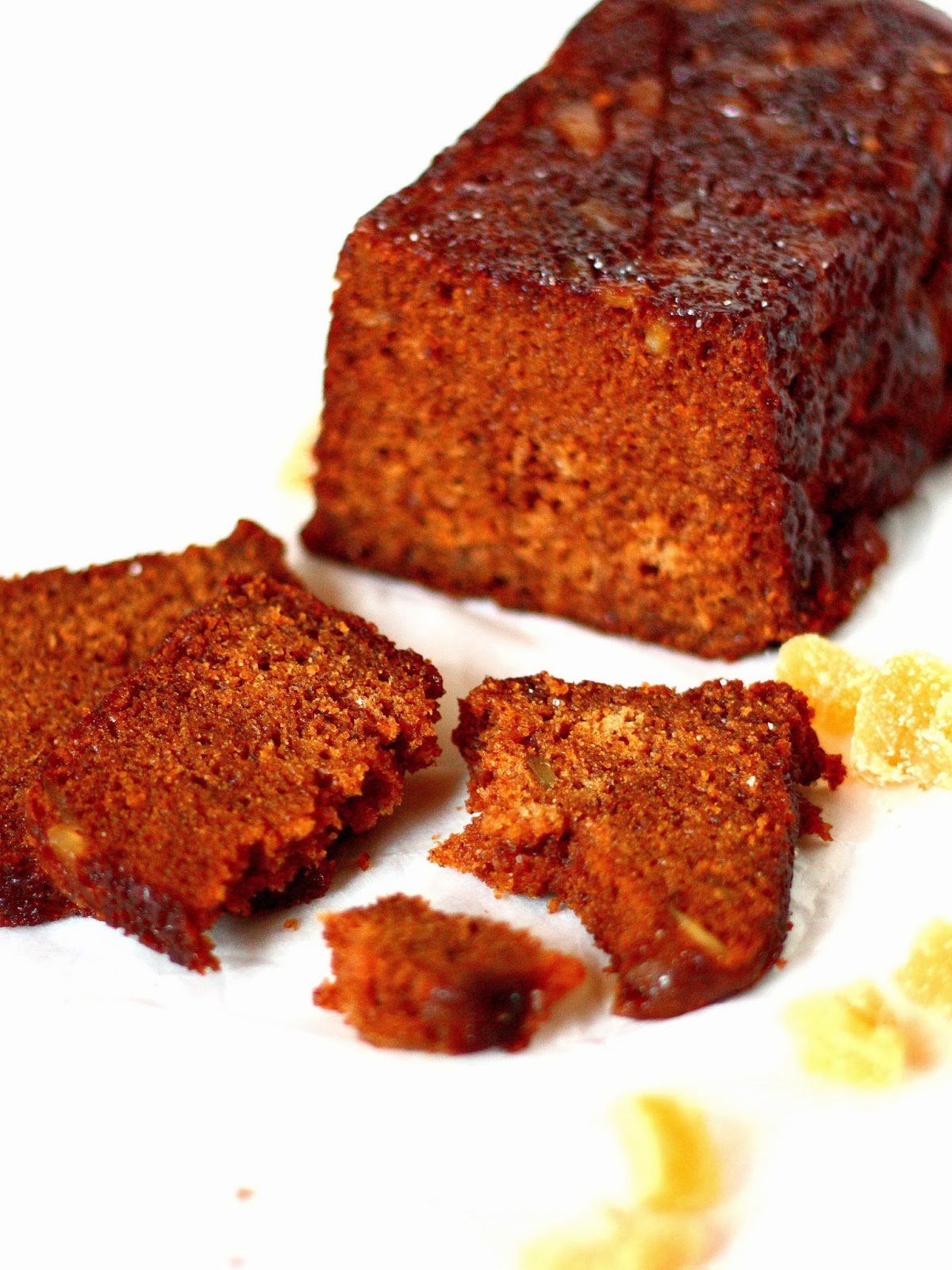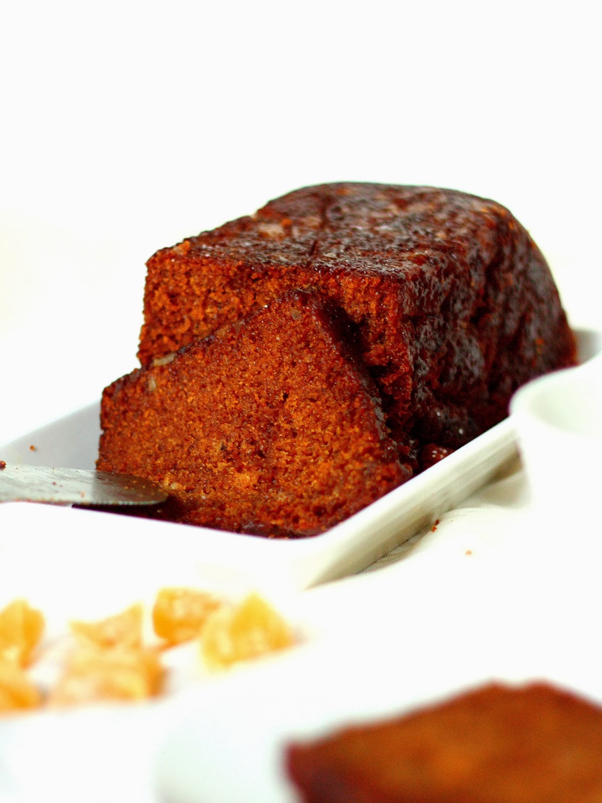 Kakun pieni miinus tuli hieman liian isoista inkiväärin palasista, jotka jauhotuksesta  huolimatta painuivat kakun pohjalle. Pienemmät palat pysyivät nätisti kakkutaikinan keskellä kypsyessä, joten asia korjaantuu kun leikkaa inkiväärinpalat pienen pieneksi.