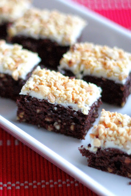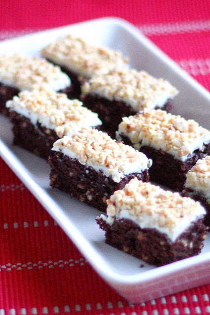Aineet: 125 g voita huoneenlämpöisenä 3.5 dl fariinisokeria kevyesti mittaan paineltuna 3 munaa 2.5 dl vehnäjauhoja 1.25 dl kaakaojauhetta 0.5 tl leivinjauhetta 0.5 tl suolaa 2 tl vaniljasokeria 1.25 dl suolattomia, paahdettuja maapähkinöitä rouhittuna