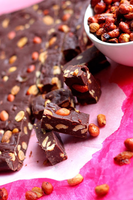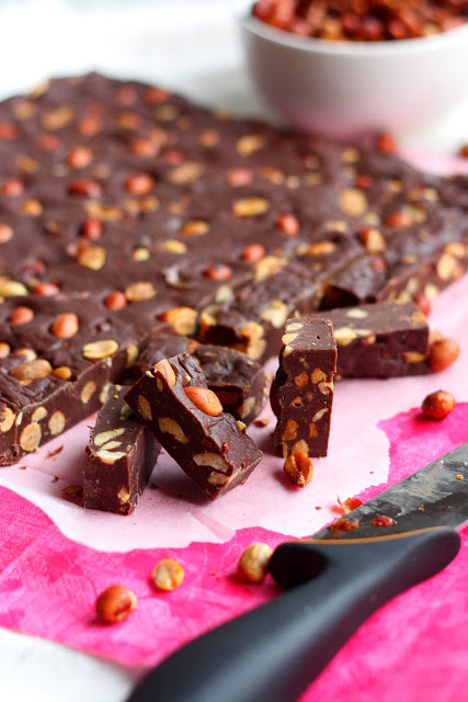Tämä fudge-ohje on suosikkini, sillä tämän tekemisessä ei tarvita lämpömittareita eikä suklaamassan keittämistä tarvitse tarvitse seurata montaakaan minuuttia. Riittää, että suklaata sekoittaa sen aikaa, kunnes kaikki on sulanut.. Sen jälkeen lisätään joukkoon halutut mausteet/pähkinät/lakut yms. ja massa vuokaan jähmettymään. Helppoa kuin mikä! Ja nopeaa! Oma suosikki makuyhdistelmäni on lakritsi-suolapähkinä, mutta kyllä nämä paahdetut maapähkinätkin sopivat joukkoon mainiosti!