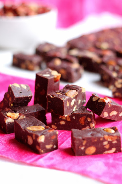Tein pitkästä aikaa suklaafudgeja kondensoitua maitoa käyttäen. Nämä ovat aina yhtä nopeita ja helppoja tehdä ja joukkoon voi lisätä miltei mitä tahansa. Tällä kertaa upotin mukaan uunissa paahdettuja maapähkinöitä.