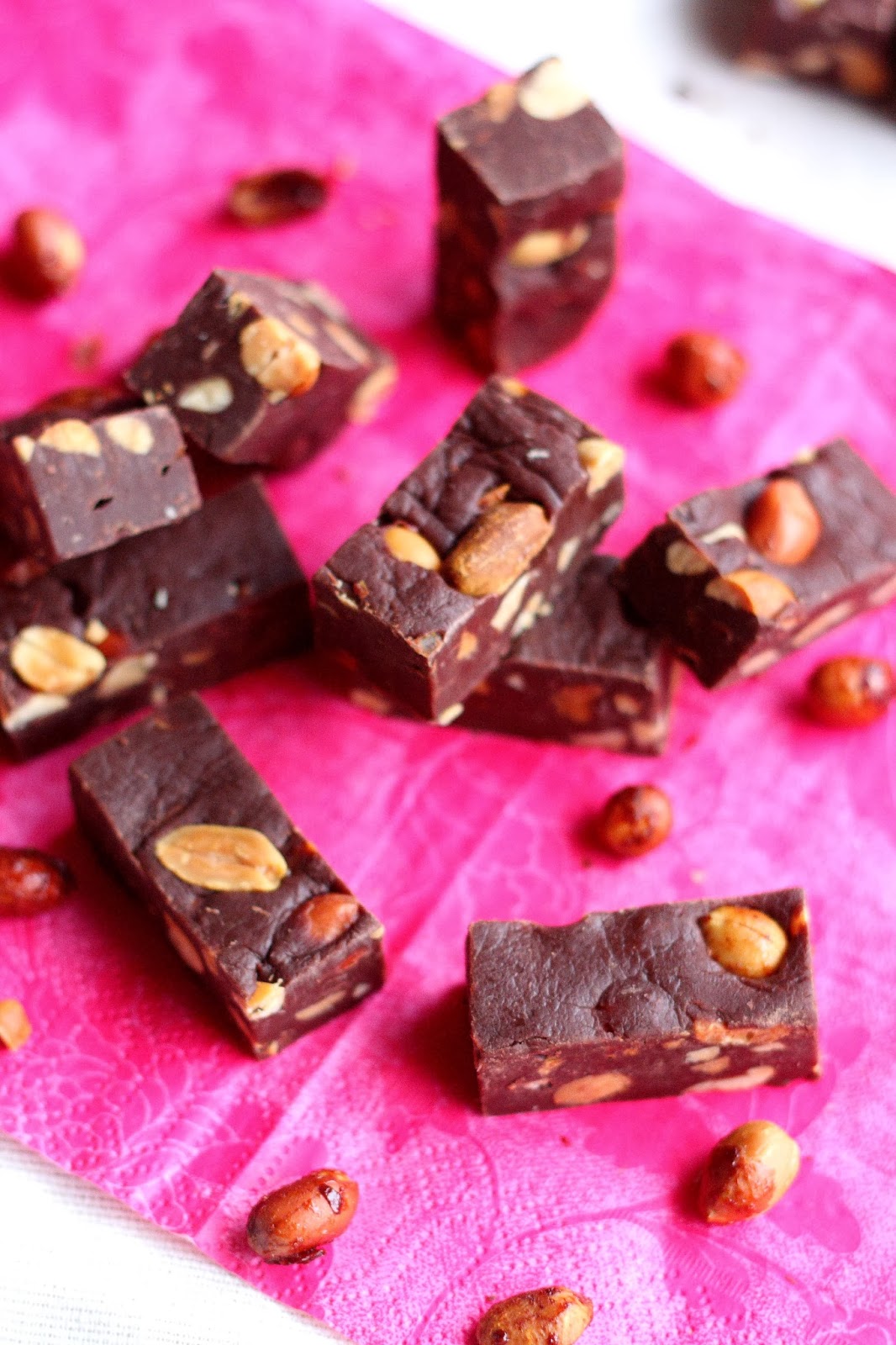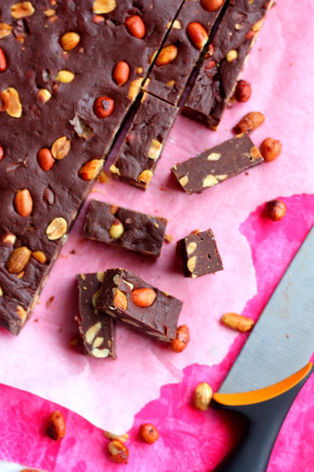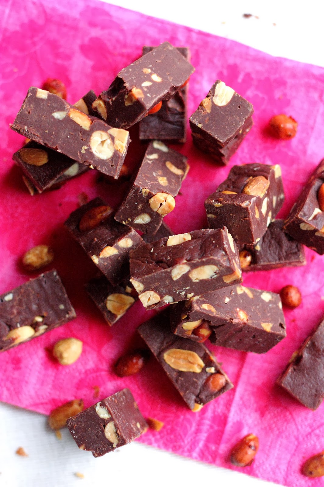 Tämä fudge-ohje on suosikkini, sillä tämän tekemisessä ei tarvita lämpömittareita eikä suklaamassan keittämistä tarvitse tarvitse seurata montaakaan minuuttia. Riittää, että suklaata sekoittaa sen aikaa, kunnes kaikki on sulanut.. Sen jälkeen lisätään joukkoon halutut mausteet/pähkinät/lakut yms. ja massa vuokaan jähmettymään. Helppoa kuin mikä! Ja nopeaa! Oma suosikki makuyhdistelmäni on lakritsi-suolapähkinä, mutta kyllä nämä paahdetut maapähkinätkin sopivat joukkoon mainiosti!
