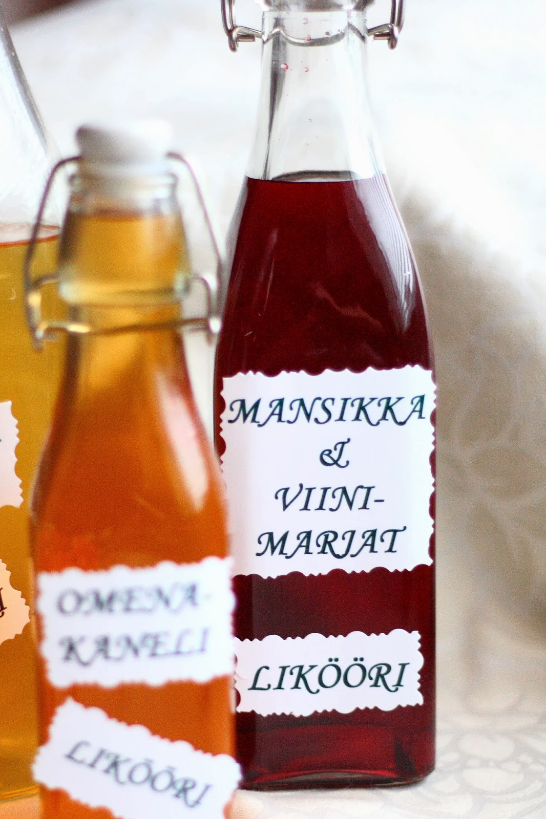 Se osa likööristä, mikä ei päätynyt pöytäliinalle sekä säästyi maistelulta, pääsi pulloihin. Likööriä tuli sen verran, että siitä riitti viiteen 7 cl vetoiseen pikkupulloon, tuolla kuvassa näkyvään pallomaiseen n. 3-4 dl vetoiseen pulloon sekä vielä yhteen puolen litran pulloon puoleen väliin asti. Eli aivan liian vähän! Tätä likööriä tulen tekemään ehdottomasti vielä uudestaankin, ja silloin isomman satsin!