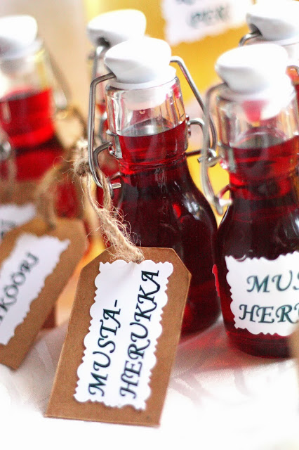 Tässä näkyy nuo etiketit. En osannut päättää vain yhtä tapaa niiden kiinnittämiseen, joten osassa ne ovat kiinni suoraan pullossa ja lopuissa tuossa lapussa.