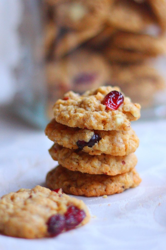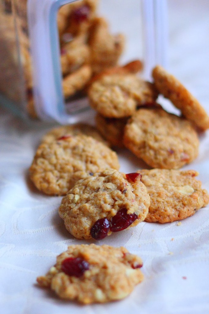 Keksit olivat tuoreena pehmeitä ja kovettuivat niiden muutaman päivän aikana, mitä ehtivät purkeissa olemaan. Maku muuttui koko ajan hieman kauraisemmaksi. Alla suunnilleen ne määrät, jolla tein. Noita karpaloita ja suklaata olisi tosiaan voinut olla tuplasti, niin olisivat olleet varmaan huippuherkkua 🙂