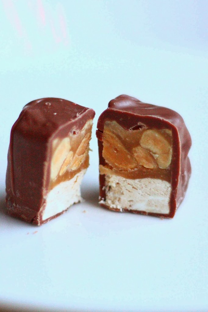 Karkkien tekeminen on mukavaa puuhaa ja nautin erityisesti kaupan herkkujen kopioimisesta tai yrittämisestä. Vaikka itsetehdyt karkit eivät olekaan täysin samanlaisia kuin kaupan versiot, niin herkullisia ne ovat silti. Tein viime keväänä pari kertaa Snickersejä ja niistä tuli ihania. Ainut ongelmakohta tuolloin oli nougatin teossa, josta ensimmäisellä kerralla tuli todella sitkeää ja toisella testikerralla murenevaista. Tällä kertaa mun piti testata glukoosisiirapin käyttöä nougatin teossa, mutta kun sain tarvikkeet esille ja kattilan hellalle, huomasin purkin olevan lopussa. Snickersien tekopuhti oli kuitenkin voimakkaasti päällä, enkä halunnut jättää herkkuja tekemättä, joten tyydyin siis vaaleaan siirappiin. Nougatista tuli jälleen murenevaista, mutta herkullisia nämä silti olivat 🙂