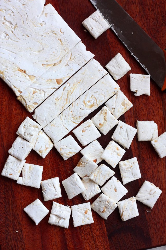 Laita kattilaan sokeri, siirappi, glukoosisiirappi ja vesi. Keitä suht kovalla lämmöllä. Tähtäät 135 asteeseeseen. Kun mittari näyttää 130 astetta, pienennä hellan lämpöä ja aloita valkuaisten vatkaaminen. Kun valkuaiset ovat vaahtoutuneet, lisää suola ja vatkaa kunnes vaahto on jämäkkää, mutta pehmeää. Kun sokeri-vesi -seos saavuttaa 135 astetta, ota kattila pois levyltä ja aloita kaatamaan seosta n. 1 rkl kerrallaan valkuaisvaahtoon koko ajan vatkaten. Tähän menee n. 2 minuuttia. Jatka vatkaamista vielä n. 1-2 minuuttia, kunnes seos alkaa irrota reunoilta. Kääntele (älä enää vatkaa) sen jälkeen öljytyllä lastalla maapähkinävoi sekaan ja kumoa seos leivinpaperilla vuorattuun n. 23 cm x 23 cm vuokaan. Tasoita, mutta älä painele. Anna jäähtyä. Vinkit: