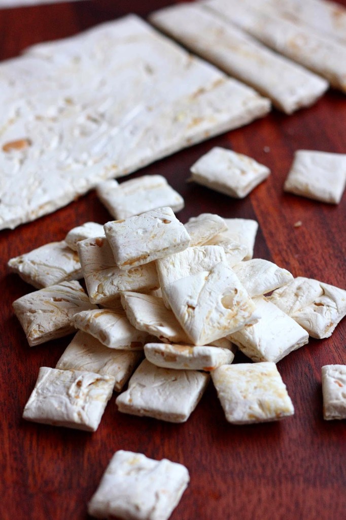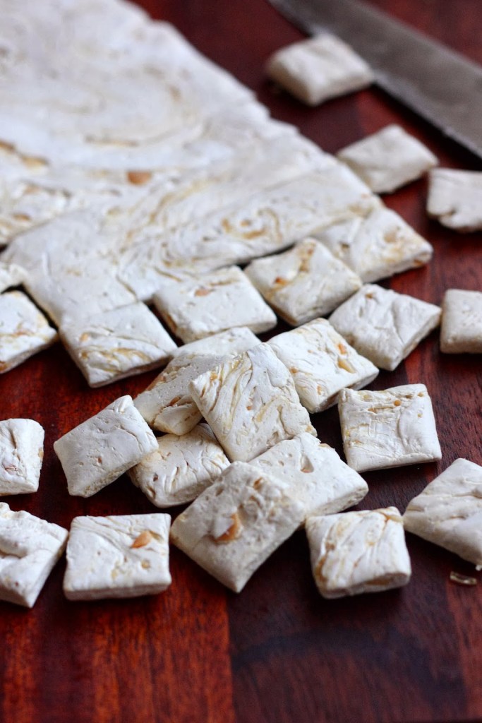 Snickersin nougat-osiosta taisi tulla mulle pieni pakkomielle. Useista yrityksistä huolimatta en onnistunut saamaan siihen haluttua koostumusta. Mietin monet päivät (ja yöt!) kaikkia onnistumiseen vaikuttavia asioista ja aloitin tarkemman tutkimuksen nougatin saloihin. Lopputuloksena syntyivät nämä pehmeät, mutta hieman sitkeät pienet ihanat maapähkinäiset nougatpalat. Salaisuus ihanaan makuun oli osaltaan karkeassa maapähkinävoissa. Palat eivät ole kauneudella pilattu, sillä näistä piti tulla Snickerin pohja. Kireä olo vyötärön seudulla kuitenkin muutti mieleni ja päätin kesken leipomisen jättää Snickerin teon johonkin toiseen kertaan (minäkö muka söin liikaa Snickersejä viime kerralla..). Palat olisi voinut toki upottaa pelkkään sulaan suklaaseen, niin näistä olisi tullut pieniä herkkuja. Ensi kerralla sitten taas 🙂