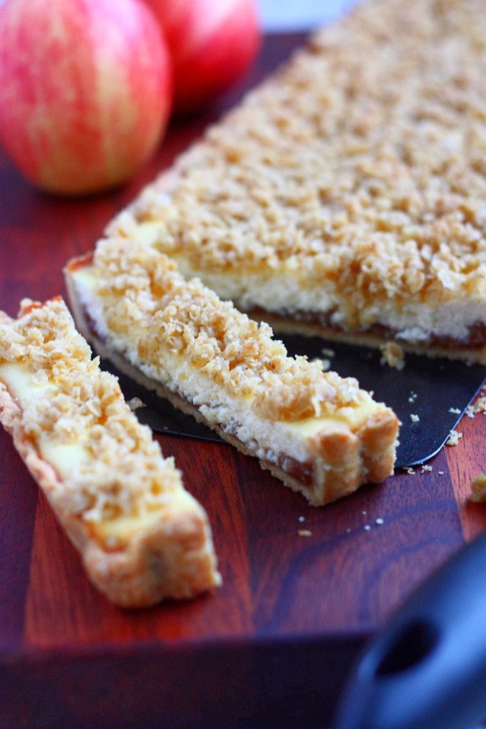 Pitkän haaveilun jälkeen olen vihdoinkin hankkinut ihanan suorakaiteen muotoisen irtopohjaisen piirakkavuoan. Vuokaa on tullut käytettyä jo useasti ja se on tällä hetkellä ehdottomasti lempparini. Vuoka pääsi jo hankintapäivänään testiin, sillä halusin testata rapean murotaikinapohjan tekoa. Pohjaa varten piti tietenkin olla jokin täytekin. Muistin aiemmin nähneeni Titantupa-blogissa herkullisen oloiset omenapiiraat, joten niiden inspiroimana kaivoin pakkasesta esiin viime syksyistä omenasosetta. Omenasose sai päälleen rahka-tuorejuustotäytteen ja piirakan kruunasi rapea kauramuruseos.