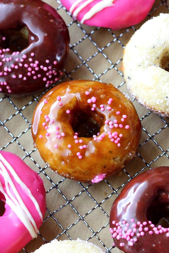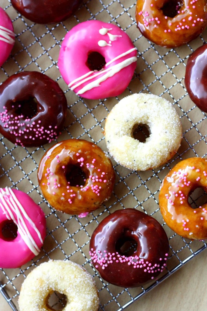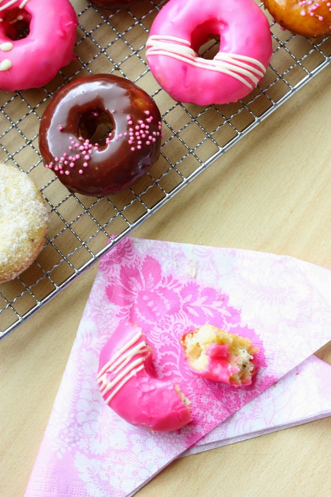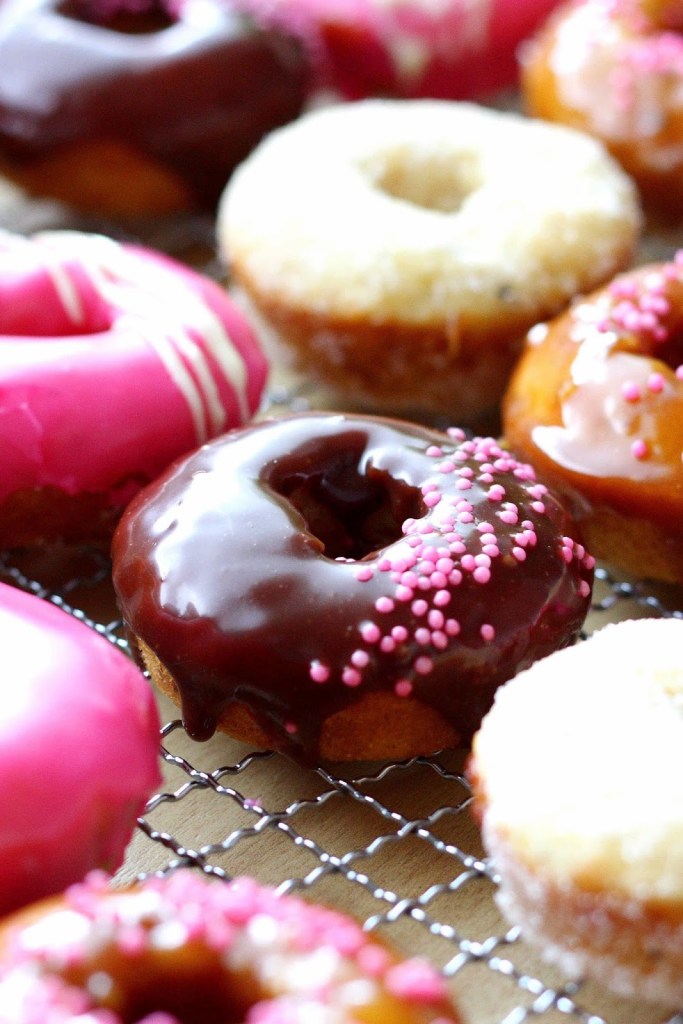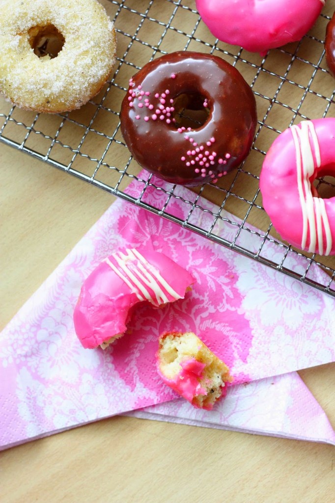 Innostuin Vappuna tekemään läjän donitseja uunissa ihanalla ohjeella. Tällä kertaa paistoin donitsit normikokoisen muffinipellin koloissa. Halusin donitseista enemmän donitsin kuin muffinin näköiset, joten porasin omenaporalla reiän valmiin tuotoksen keskelle. Porauksessa syntyneet hieman röpelöt reunat katosivat kuorrutteiden alle ja näistä tuli aika kivannäköisiä. Ja jälleen aivan ihanan makuisia!