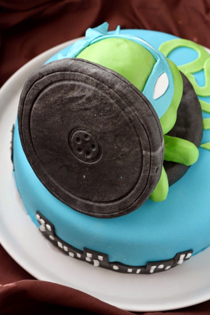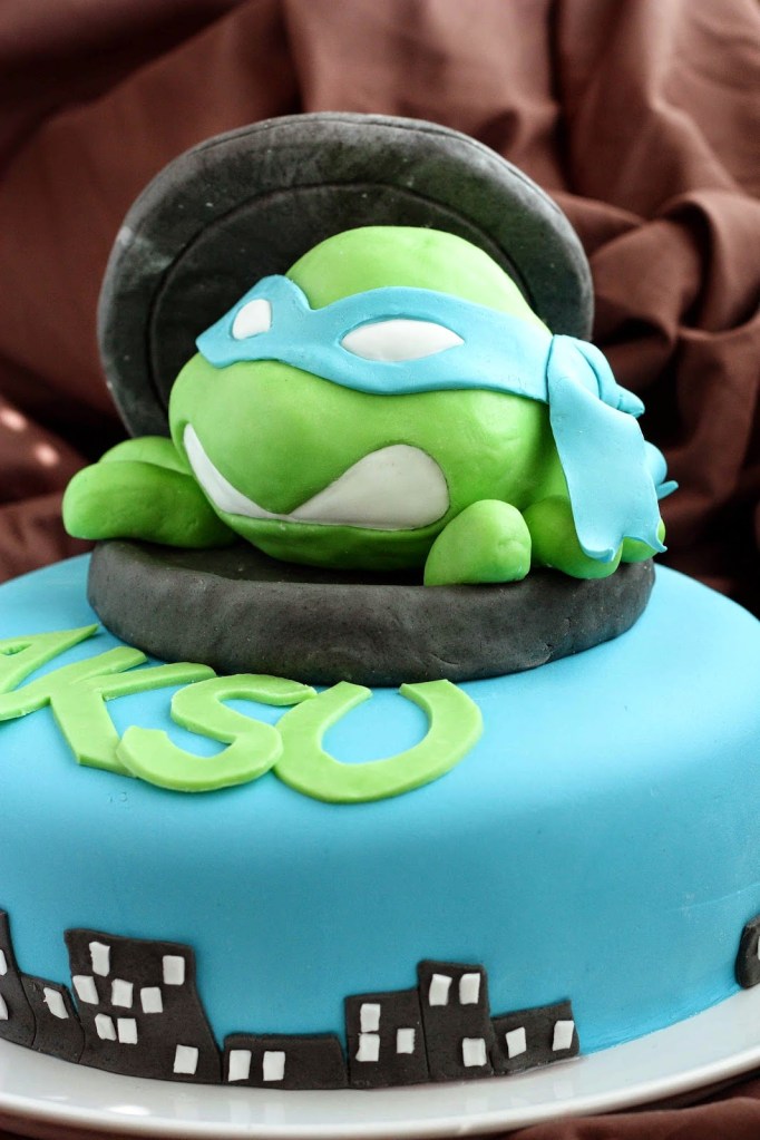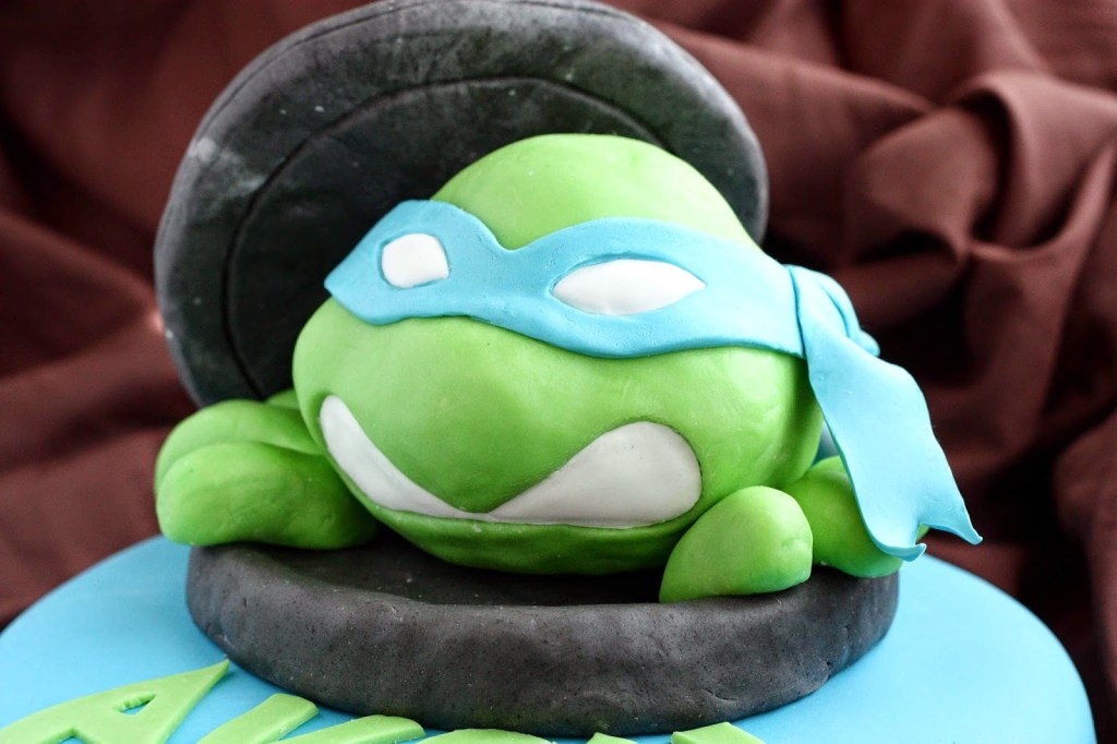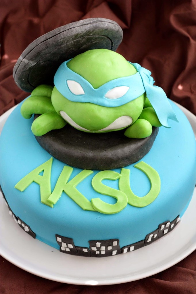 Veljenpojan 6-vuotissynttäreitä vietettiin viime viikonloppuna ja sain tehdä juhliin kakun. Toiveena oli mutanttininjakilpikonna Leonardo. Vilkaisu nettiin sai nuoruuden muistikuvani näistä sammakkohahmoista henkiin ja muistin kyseessä olevan yksi neljästä viemäreistä nousevista turtleseista. Näistä joukon johtajana toimivalla Leonardolla on sininen huivi. Kakusta tuli tällainen..