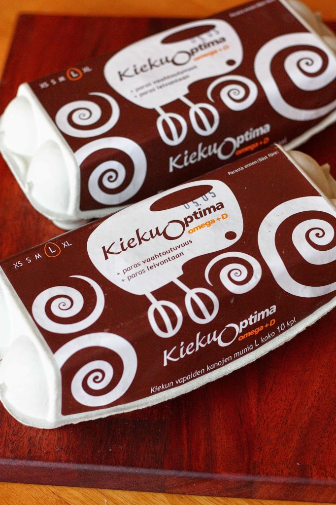Laitan nyt samalla pienen infopaketin kakussa käyttämistäni Kiekun leivontamunista, joita sain koekeittiöni käyttöön muutaman paketillisen jo muutama viikko sitten. Olen ehtinyt testailemaan munia tämän kakun lisäksi jo useampaankin vaahdotettavaan (muna-sokeri-vaahto) kakkupohjaan (Äitienpäivän vadelmatäytteiseen kakkuun, Tähtikakkuun, Turtles-kakkuun ja Vappupallo-kakkuun). Munien mainostetaan olevan parempia munia leivontaan erityisesti niiden rasvahappokoostumuksensa ansiosta. Kokemukseni mukaan ne vaahtoutuivatkin selvästi paremmin ja nopeammin, kuin tavalliset kananmunat. Yleensä munia suositellaan vaahdotettavan huoneenlämpöisinä, mutta Kiekumunat vaahtoutuivat sokerin kanssa paksuksi vaahdoksi erittäin nopeasti myös jääkaappikylmänä!