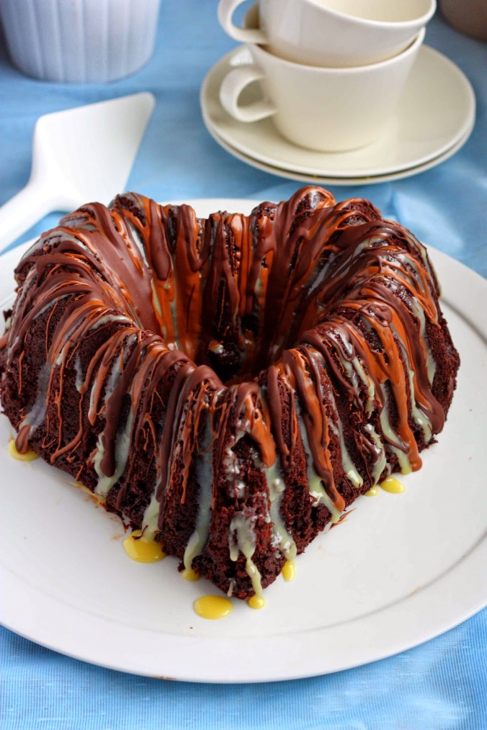 Voitele kahvikakkuvuoka kunnolla. Kaada taikina vuokaan. Paista 140 asteessa n. 50 minuuttia ja laita tämän jälkeen kiertoilma päälle (tai nosta uunin lämpötila 170 asteeseen) ja jatka paistamista n. 5-10 minuuttia, kunnes kakku on kypsä. Anna kakun jäähtyä vuoassaan n. 5 minuuttia ennen kuin kumoat sen lautaselle. Jätä kakkuvuoka kakun päälle jäähtymisen ajaksi. Peitä jäähtynyt kakku esim. kelmulla ja säilytä huoneenlämmössä ennen kuorruttamista. Tee kuorrute sulattamalla suklaat. Lisää valkosuklaan joukkoon hieman kuohukermaa. Lisää 3 tippaa piparminttuaromia valkosuklaaseoksen joukkoon. Roiski suklaat kakun päälle koristeraidoiksi. Anna jähmettyä hetki.