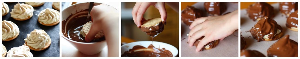 Pilko suklaa paloiksi ja sulata mikrossa varovasti puolen minuutin välein sekoittaen. Jäähdytä sula suklaa hieman, mutta älä anna jähmettyä. Kasta vaahtokeot sulassa suklaassa ja nosta leivinpaperille. (Tästä vaiheesta muistin nappasta muutaman kuvankin, alla).