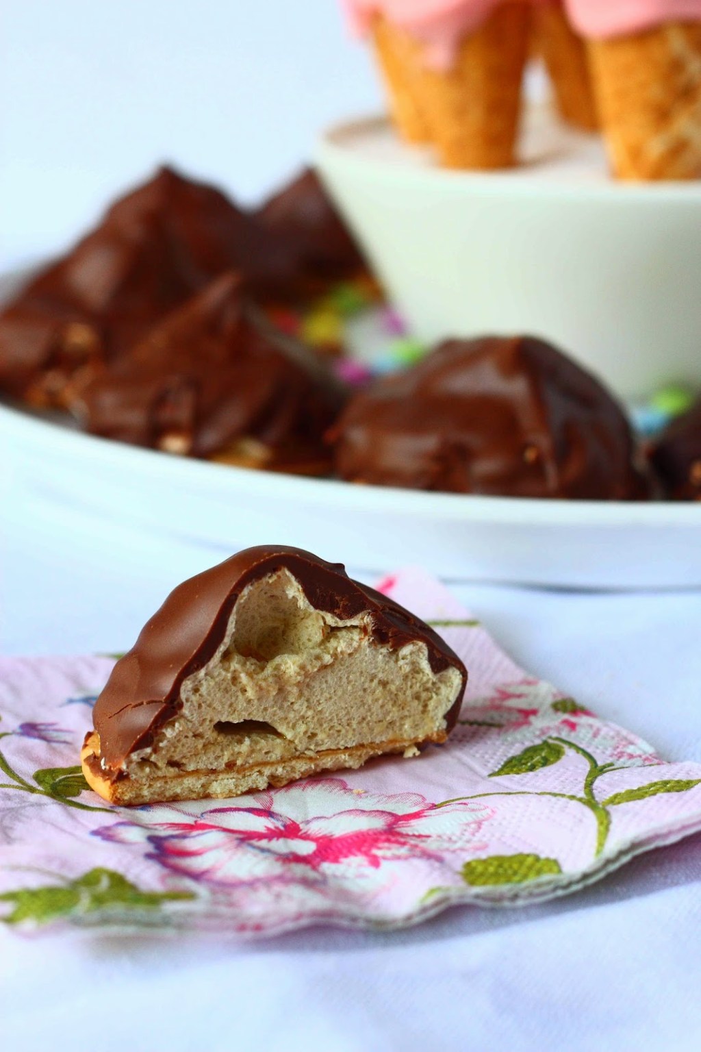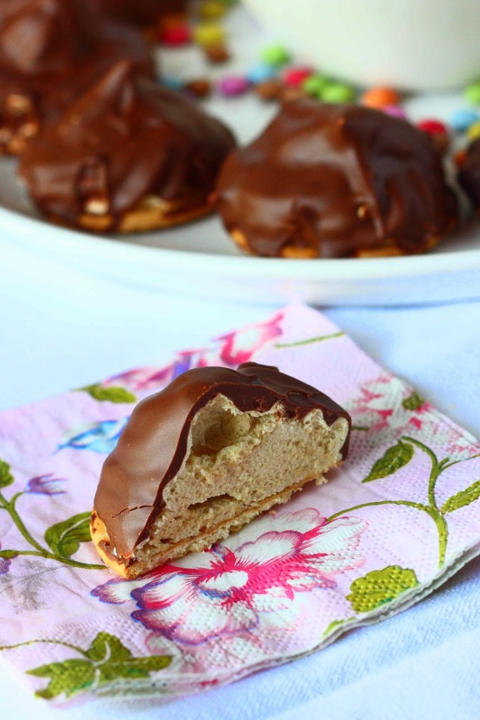 Sekoittelin marenkimassaa kahvijauheen lisäämisen jälkeen hieman liikaa, jolloin seos löystyi sen verran, ettemme voineet pursottaa keksien päälle kovin korkeita kekoja. Vaahdon joukkoon kannattaakin sekoitella mahdolliset makuaineet nopeasti käännellen, niin että ne juuri ja juuri sekoittuu marenkimassaan, niin massa pysyy paksumpana ja pusuista saa korkeampia. Teimme yhteensä 20 matalaa pusua. Valmiiden pusujen maku oli tosi hyvä, sopivasti mokkainen, mutta täytettä tosiaan olisi saanut olla rutkasti enemmän. Marie-keksit olivat aitojen pusujen ”aluslevyyn” verrattuna hiukkasen liian kovia ja kaipasin pusujen ”aluslevyyn” vielä enemmän vohvelimaisempaa rakennetta. Toisaalta, jos näitä ei ajattele pusuina, vaan suklaisina mokkakekseinä, toimii Marie näissä loistavasti miedon makunsa takia.