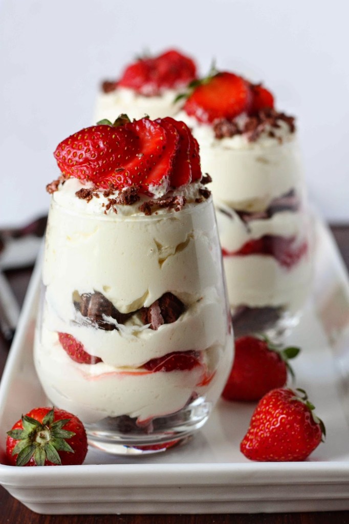 Kokoa jälkiruoka-annokset. Murustele käsin kunkin lasin pohjalle yksi keksi. Lisää lusikallinen moussea ja muutama pienemmäksi pilkottu mansikka sekä hieman mousse. Lisää taas murusteltu keksi, moussea, mansikoita ja moussea.. Koristele keksin murusilla ja mansikoilla.
