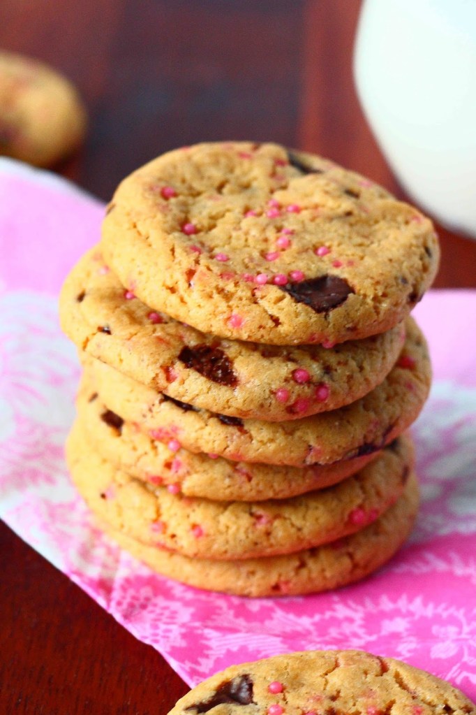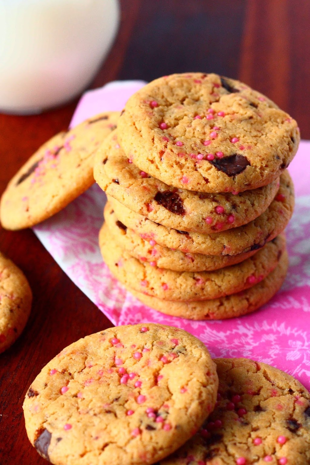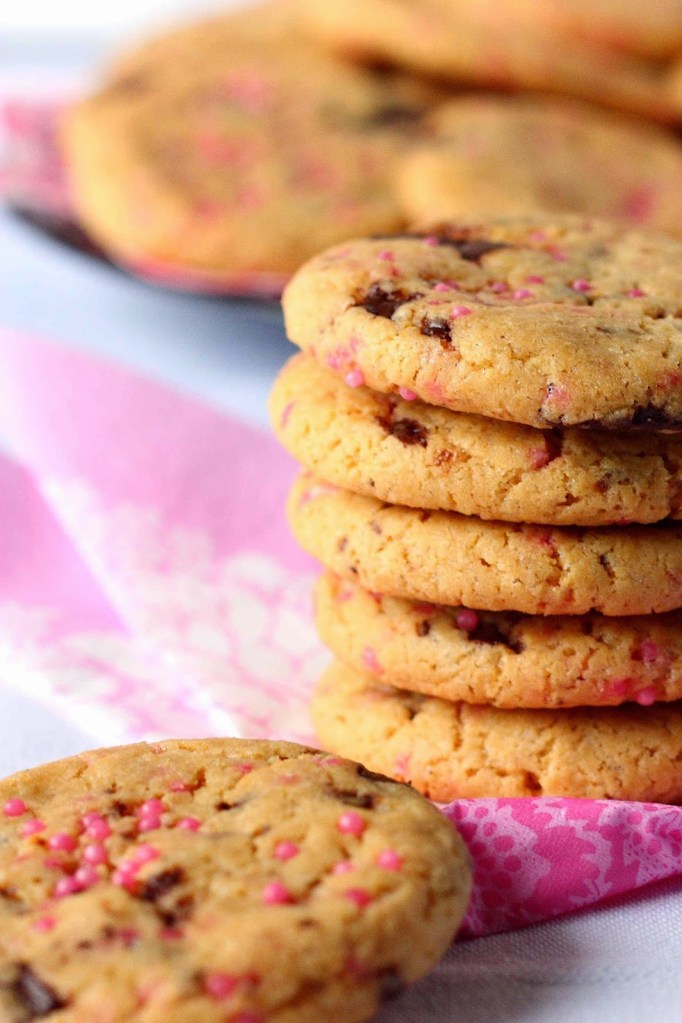 Koska keksit tulivat tytön juhlapöytään, kaipasin niihin myös hieman tyttömäisyyttä, ja ripottelin taikinaan myös hieman vaaleanpunaisia nonparelleja. Pelkäsin, että ne menettäisivät väriä uunissa, mutta väri pysyikin aika kivasti. Näitä voiskin tuunata mieleisekseen eri värisillä nonparelleilla.