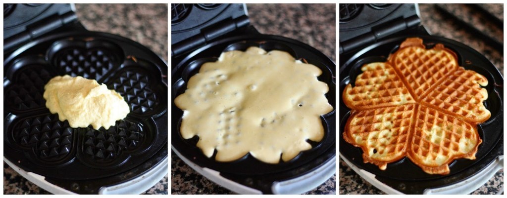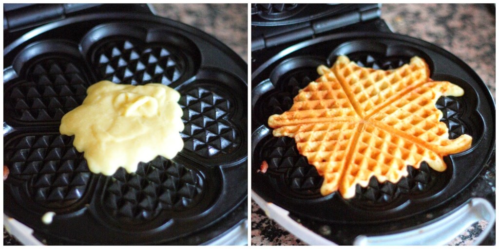Kuumenna vohvelirauta. Laita n. 1-2 ruokalusikallista taikinaa vohveliraudan keskelle. Levitä taikina mahdollisimman tasaiseksi kerrokseksi. Muoto olisi hyvä pitää suht koht pyöreänä itselläni tosin yrityksistä huolimatta tuli välillä tuollaiset sakarat reunoille.). Paista n. 2 minuuttia, kunnes vohveli on saanut väriä pintaansa ja hieman ruskettunut. Paistoaika riippuu vohveliraudan tehoista, joten tarkkaile tilannetta. Älä polta.