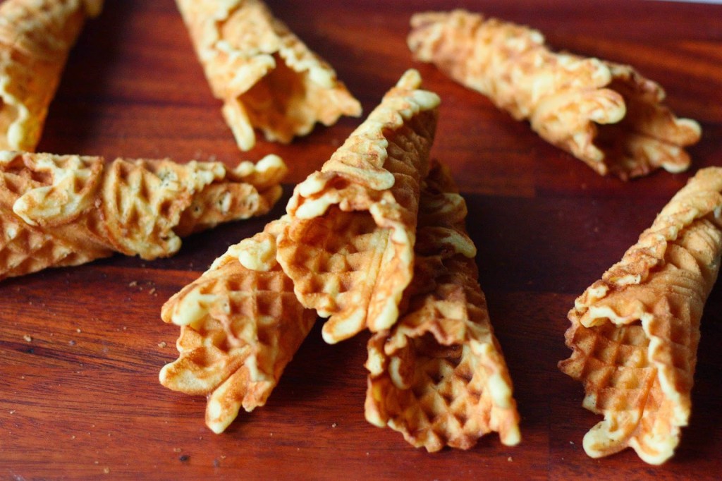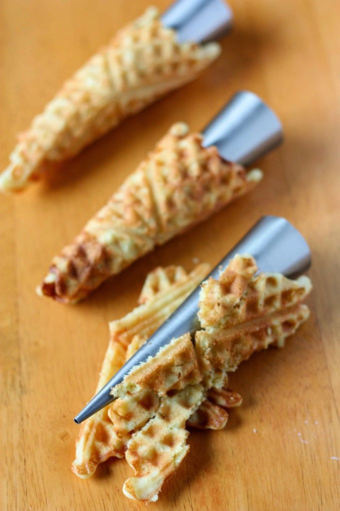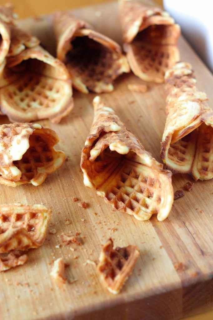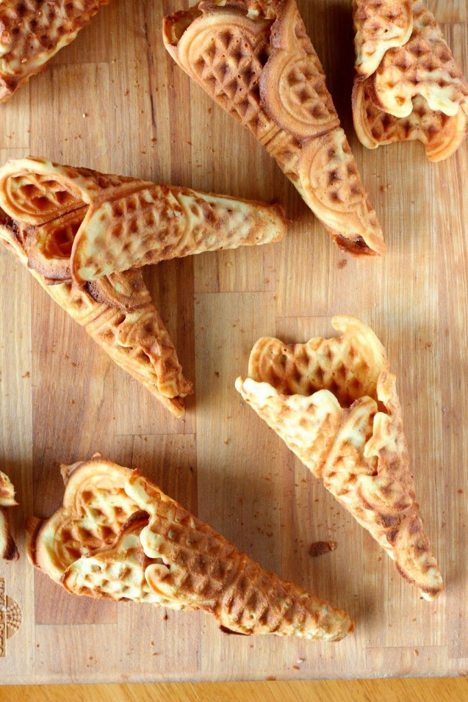 Meillä ei ole jäätelövohvelien tekoon tarvittavaa vohvelirautaa, joten paistoin vohvelit tavallisella vohveliraudalla. Tötteröistä tuli hieman paksumman puoleisia. Aidolla vohveliraudalla saisi huomattavasti ohuempia. Meillä kuitenkin jäätelövohvelien menekki on sen verran pientä, ettei vohveliraudan hankinta ole mielekästä, joten jatkossakin mennään vohveliraudalla silloin harvoin kuin niitä tullaan tekemään. Toimivat ohjeet uunissa tai paistinpannulla paistettaviin rapsakoihin vohveleihin olisi tosi kivoja..