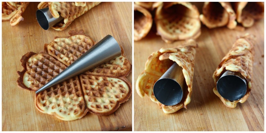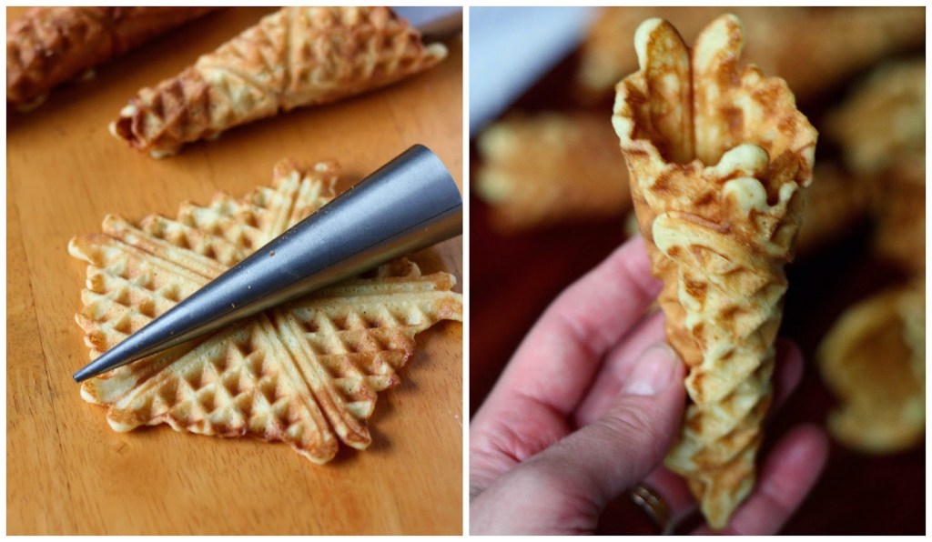 Nosta valmis, kuuma vohveli pois ja kääri samantein tötterön ympärille jäätelövohvelin muotoiseksi. Jos et omista tötteröitä, voi muotoilla esimerkiksi foliosta kartion, ja kääriä vohvelin tämän ympärille. Laita jäähtymään sauma puoli alaspäin. Voit tarvittaessa tukea suuaukkoa folion palalla, jos se ei meinaa pysyä pyöreänä.