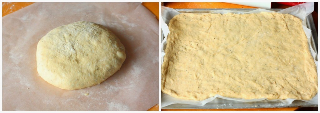 Kumoa taikina alustalle. Kaulitse taikina pellin kokoiseksi levyksi ja nosta leivinpaperin päälle pellille.