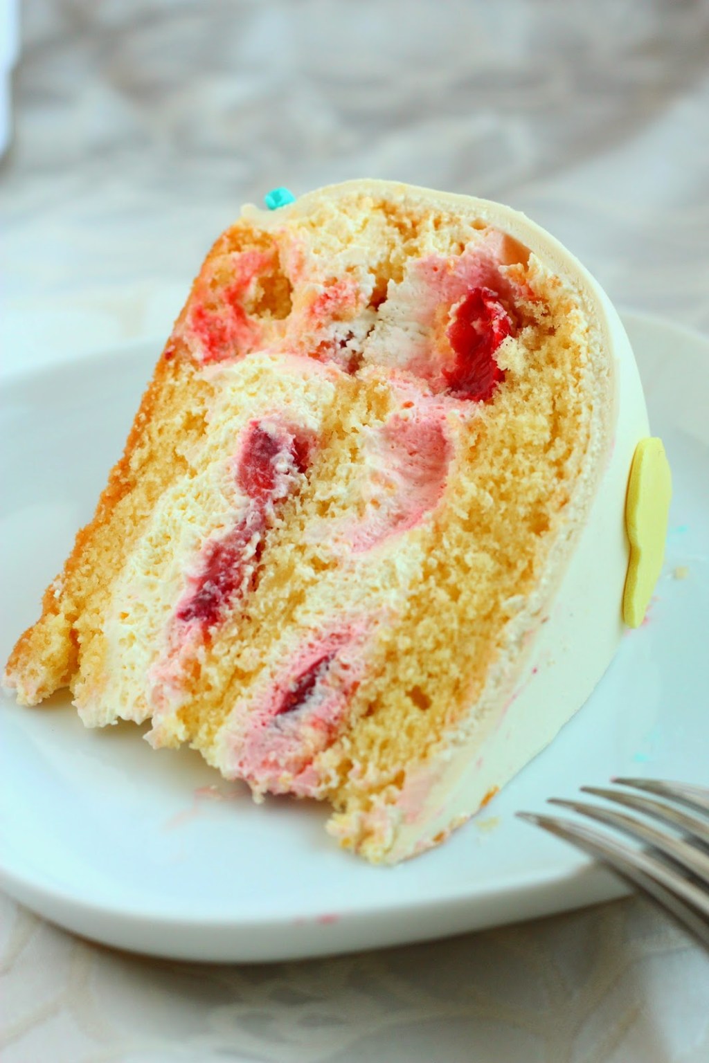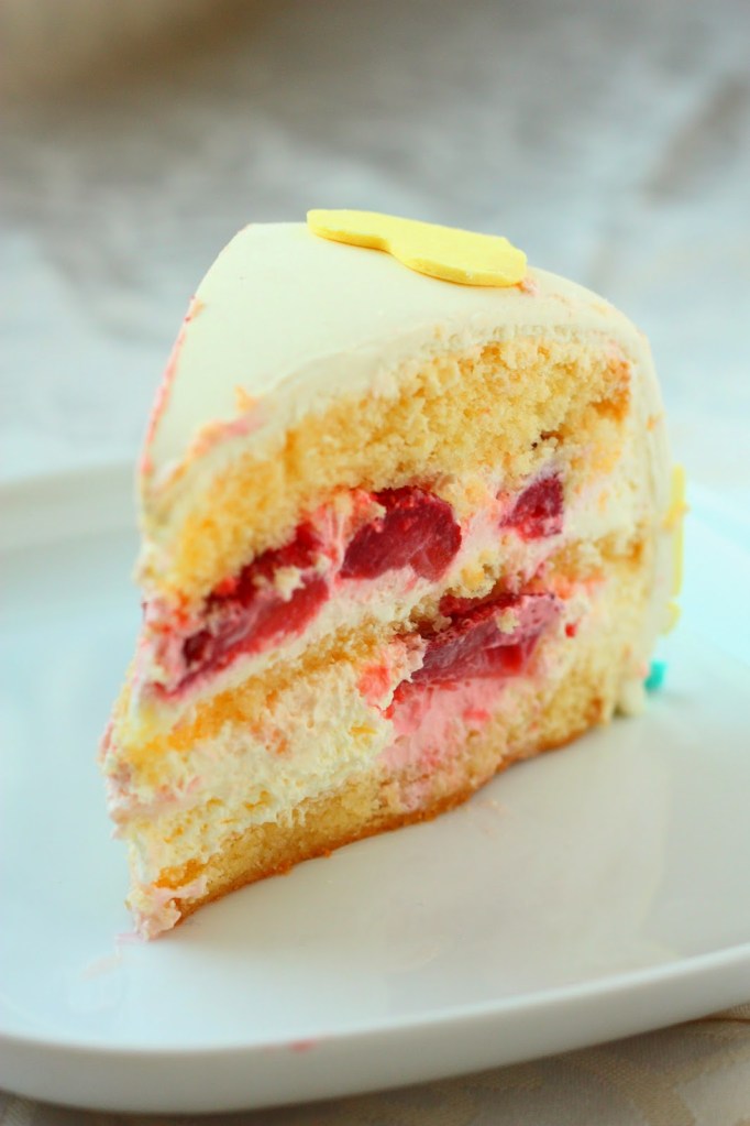 * Jos käytät pakastemansikoita, lisää ne kakun väliin kohmeisina.