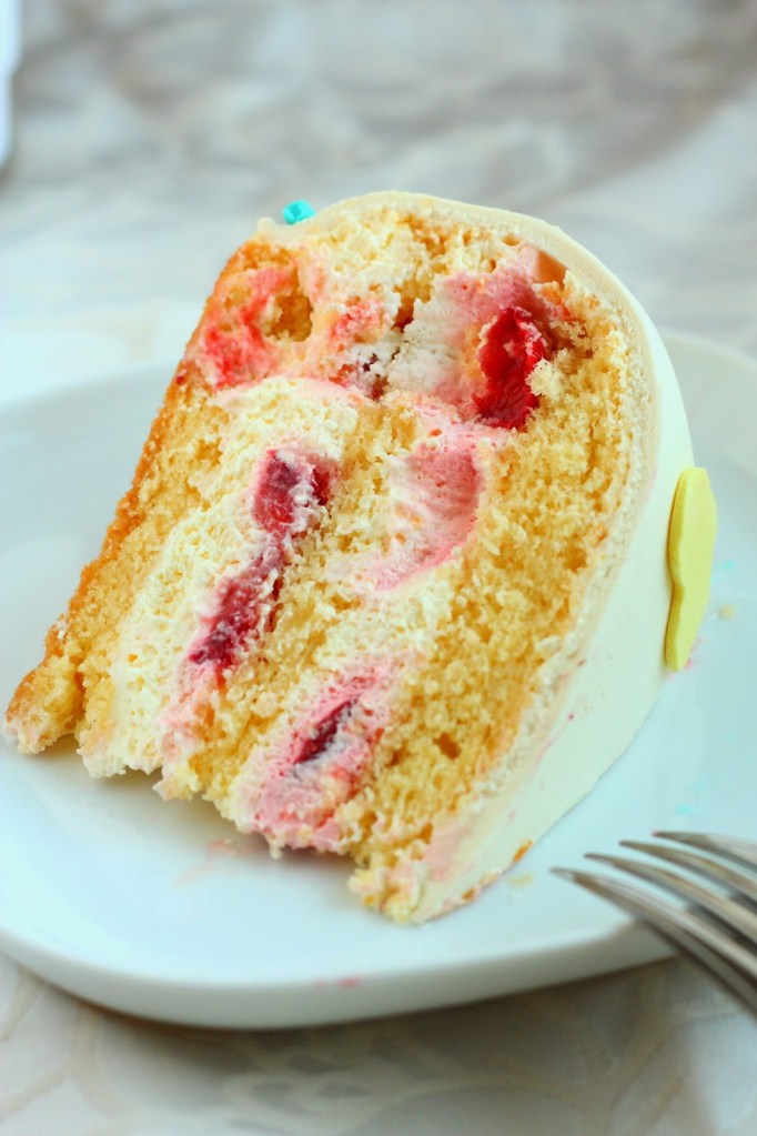 6. Kakkua kannattaa kostuttaa vähemmän tai ei ollenkaan pakastemansikoita käyttäessä, niin ei tule liian vetistä. Jos haluaa olla varma kostutuksesta (ja täytteeseen kelpaa myös soseutetut mansikat), niin alimpiin kerroksiin voi käyttää kostuketta vain hyvin vähän tai jopa jättää kokonaan väliin, hurauttaa hitaasti sulaneet mansikat (joista on miltei kaikki ylimääräinen liemi valutettu pois) ja sivellä mansikkasosetta pohjien pinnalle. Mansikkasose itsessään kostuttaa pohjat hyvin. Leivontailoa! 🙂