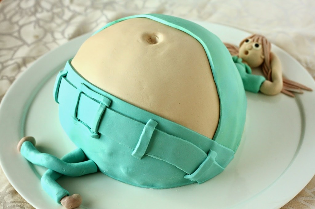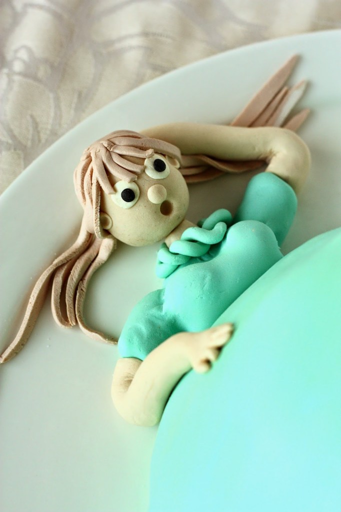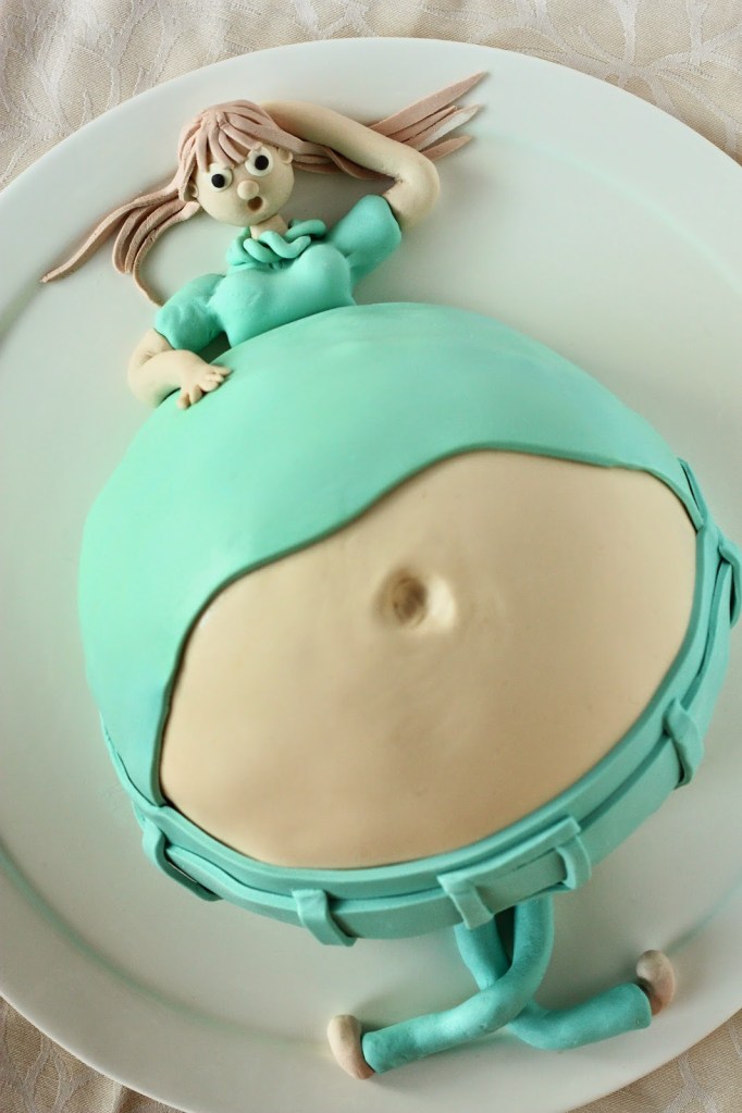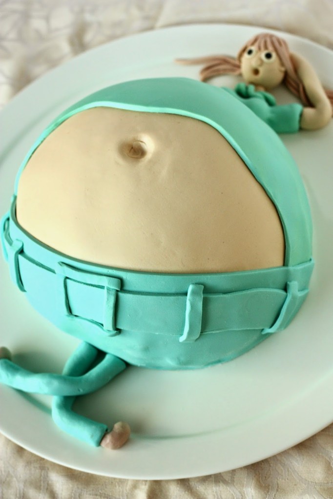 Lupauduin (= tarjouduin) tekemään ystäväni vauvakutsuille kakun. Pari päivää ennen juhlia päähäni pälkähti mielikuva kakusta ja mahasta, ja sehän piti toteuttaa. Tällainen siitä tuli 🙂 Kakun jo ollessa matkalla juhlapaikalle, huomasin että tyttö olisi kaivannut hieman poskipunaa; tuleva äiti on melko kalpea. Ehkä se kuitenkin jo tällaisella vatsalla on melko luonnollistakin 😉