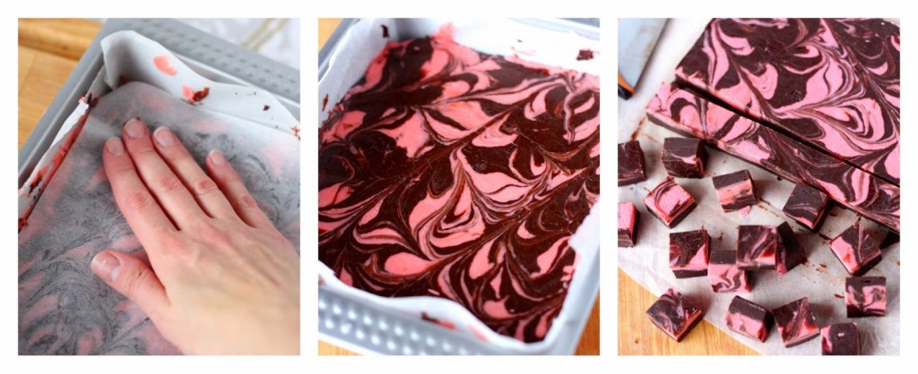 Valmiiden fudgepalojen pinta hieman halkeili (kuten kuvistakin näkee), enkä osaa varmaksi sanoa, vaikuttiko suklaaseoksen hellalla oleskelu tähän vai ei. Tosin valkosuklaaseoksella kävi samoin, eli röpelöiseksi jäi. Olikohan piparminttuöljyä joukossa kuitenkin liikaa, hmm.. Syyn uskoisin kuitenkin löytyvän siitä, että koska marmoroinnissa pitää olla todella vikkelä, tällä kertaa touhusin toinen käsi kamerassa ja otin vaihekuvia. Näin suklaaseokset ehtivät jähmettymään pinnasta liikaa, ennen kuin sain ne marmoroitua ja tasoitettua. Viime kerralla kamera oli muualla ja sain marmoroinnit tehtyä samantein. Toinen ulkonäkövika löytyy leikkauspinnasta. Ulkona alkoi tulla pimeää ja halusin ottaa kuvat luonnonvalossa. Leikkasin palat, kun ne olivat juuri ja juuri jähmettyneet, mutta eivät tarpeeksi kovat, jottai leikkauspinnasta olisi tullut täysin siisti.. Ja kuvatkin tuli otettua hätäiseen, joten ovat mitä ovat. Onneksi tällaisen pienet ulkonäköiseikat eivät vaikuta makuun. Ja makuhan oli aivan ihana ja suosittelen eh-dot-to-mas-ti kokeilemaan! 😀