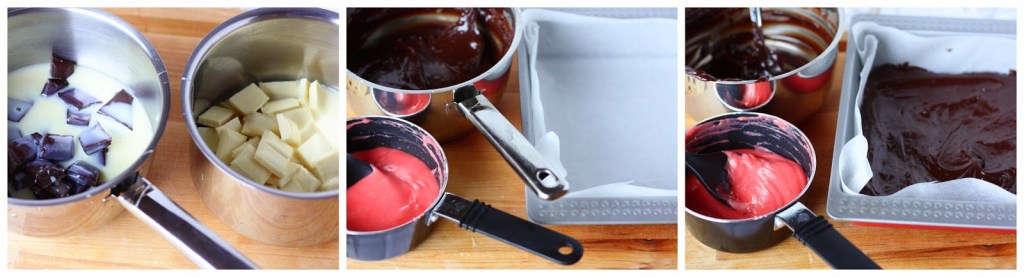 Vuoraa n. 20 x 20 vuoka leivinpaperilla. Rouhi suklaat pieniksi.Ota esille kaksi kattilaa. Laita toiseen n. 2 1/4 dl kondensoitua maitoa sekä pilkottu tumma suklaa ja voi nokare. Laita toiseen kattilaan loput maidosta (n. 4/5 dl) sekä pilkottu valkosuklaa. Laita molemmat kattilat levylle ja lämmittele seoksia miedolla lämmöllä välillä sekoitellen kunnes suklaat sulaa. Kun suklaat ovat sulaneet, lisää valkosuklaaseoksen joukkoon noin 5 tippaa piparminttuöljyä (ja pastaväriä). Sekoita tummaan suklaaseokseen noin 10 tippaa piparminttuaromia.