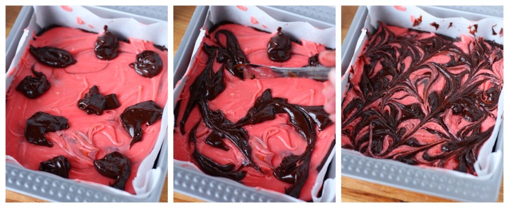 Toimi tämän jälkeen nopeasti. Ota tummasta suklaaseoksesta erilleen n. 2-3 rkl. Kaada loput vuokaan ja levitä nopeasti pohjalle. Levitä päälle valkosuklaaseos tasaiseksi kerrokseksi ja tiputtele sen päälle sivuun ottamasi tumma suklaaseos nokareittain. Vetele heti veitsellä pintaan kuvioita. Napauta vuokaa voimakkaasti pöytää vasten, niin pinta tasoittuu.