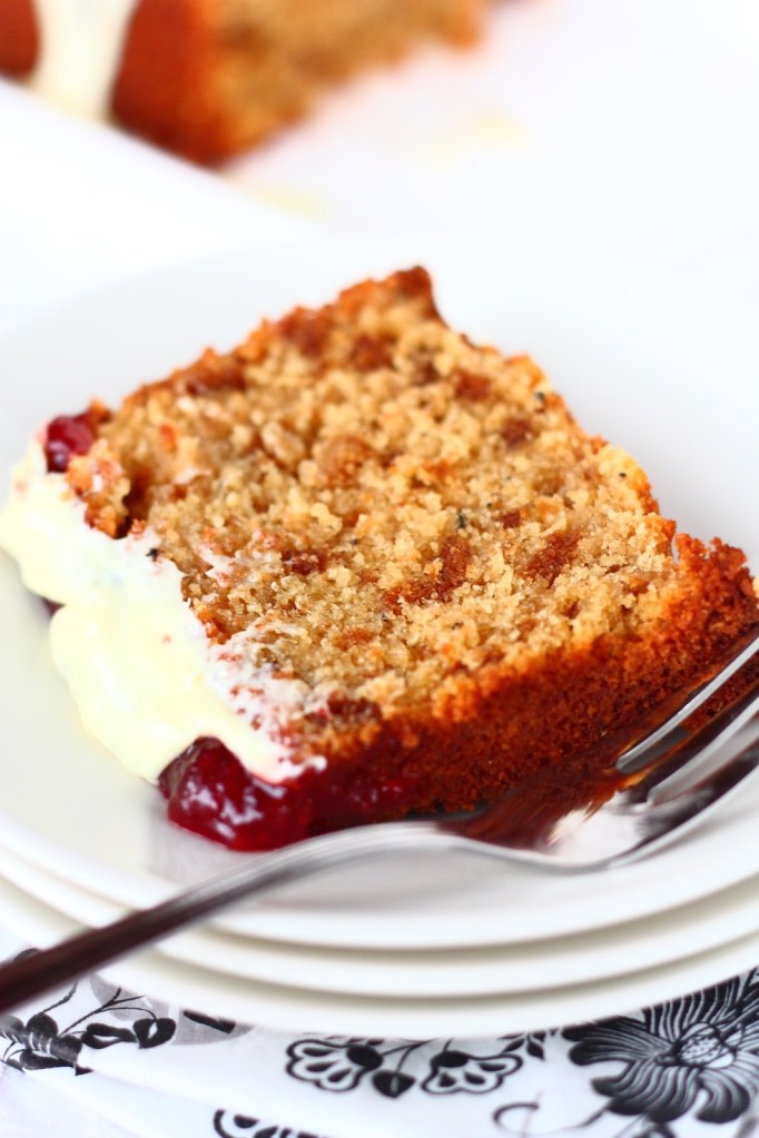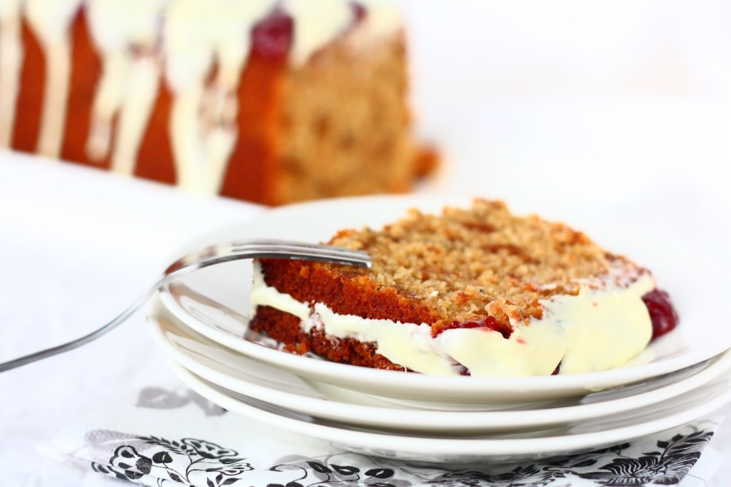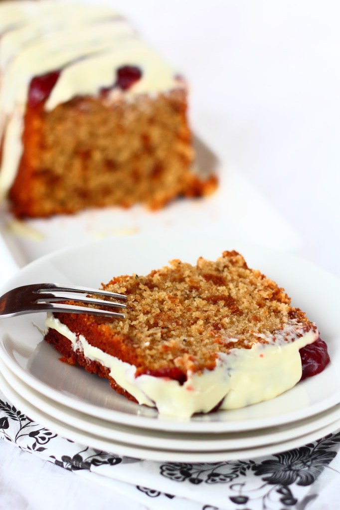Kakku olikin oiva tapa hukata hieman Joulusta ylijääneitä piparkakkuja. Jätin ne melko rouheiksi paloiksi ja ne näkyivätkin kivasti kakun sisuksista tuollaisina tummempina läiskinä. Ja toivat myös hieman lisämakuakin. Kakku oli miedosti kardemummainen ja manteli maistui miedosti. Mantelijauho toi kakkuun mukavasti lisäkosteutta.