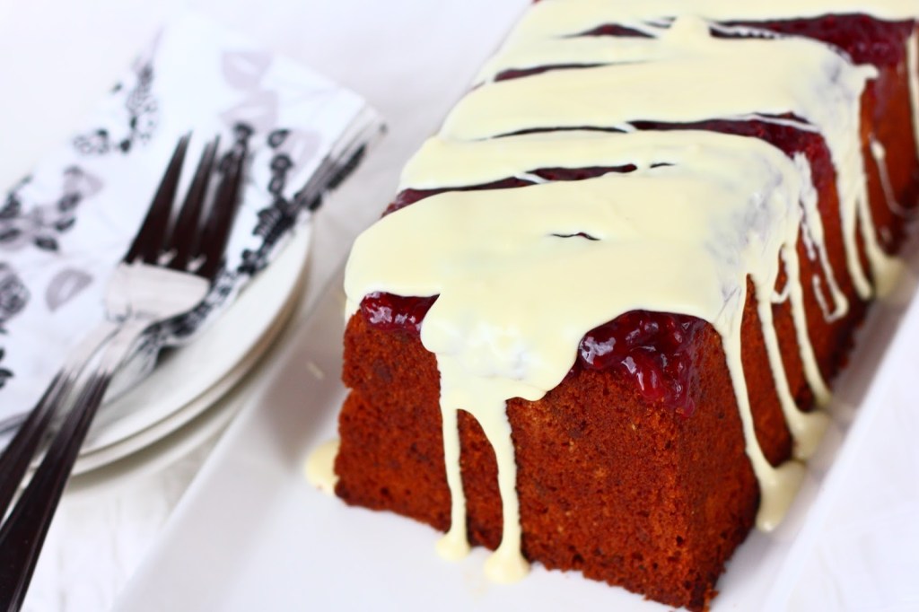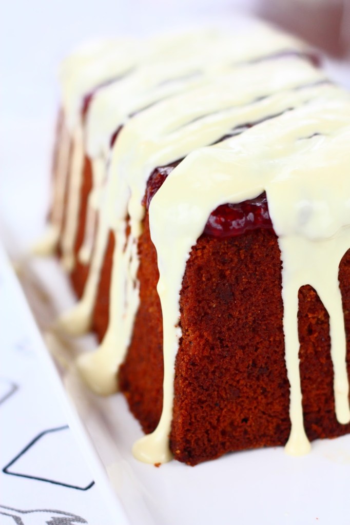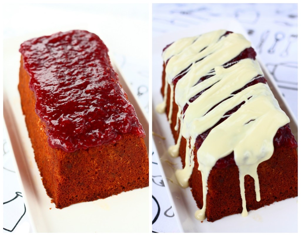 Kun kakku on miltei jäähtynyt, levitä pinnalle kerros vadelmahilloa. Sulata valkosuklaa mikrossa varovasti välillä sekoitellen (kannattaa sekoitella lämmityksen alkupuolella muutaman sekunnin välein, sillä valkosuklaa palaa helposti ja rakenteesta tulee kokkareinen. Nimim. kokemusta on 😉 ). Liruttele sula valkosuklaa kakun päälle raidoiksi.