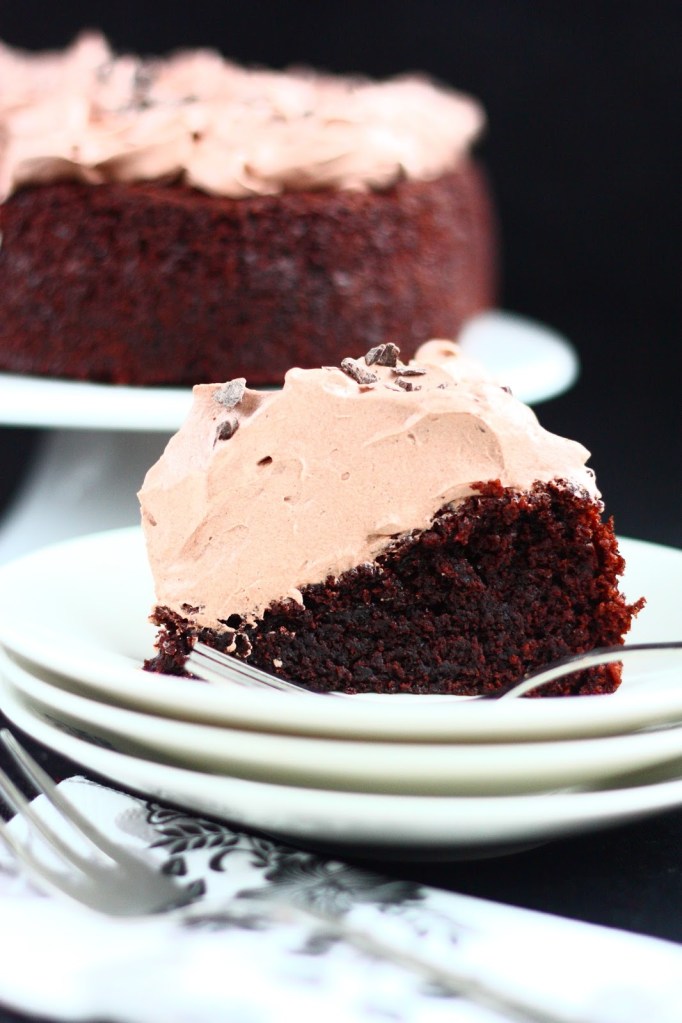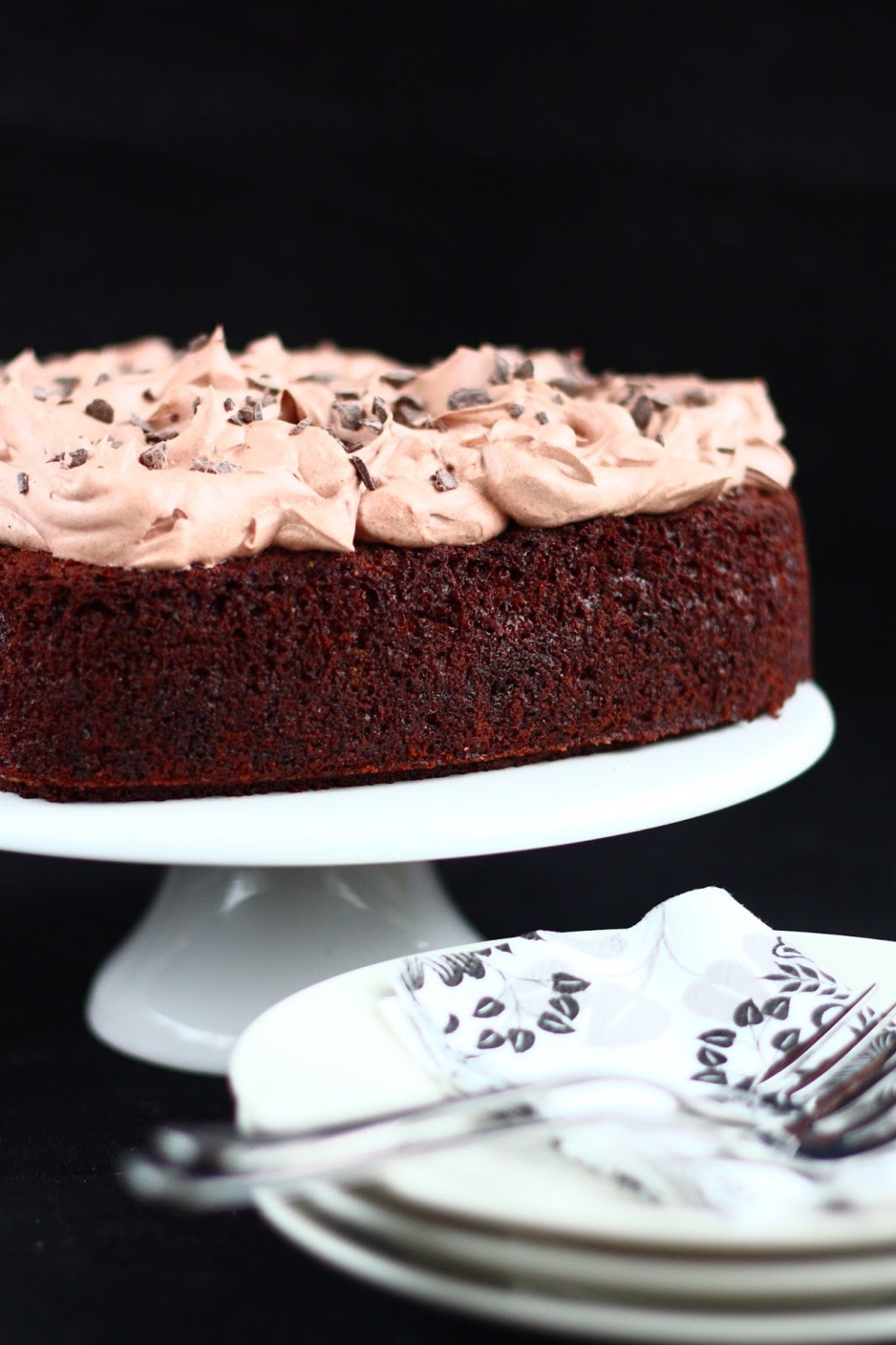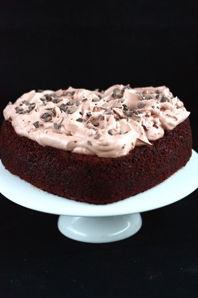 Kakku on kokonaisuudessaan munaton, joten käy myös munattomille henkilöille. Kakun keskusta painui munattomuudesta johtuen jäähtyessään kuopalle. Siitä tuli kuitenkin kiva paikka kaakaokermavaahdolle eli tummalla kaakaojauheella ja sokerilla maustetulle kermavaahdolle. Tuo on monikäyttöinen vaahto moneen paikkaan ja sitä voi pursotella vaikkapa täytekakun reunoillekin. No mutta nyt se pääsi tämän kakun päälle pehmentämään ja tasapainottamaan kakkupohjan suklaista makua.