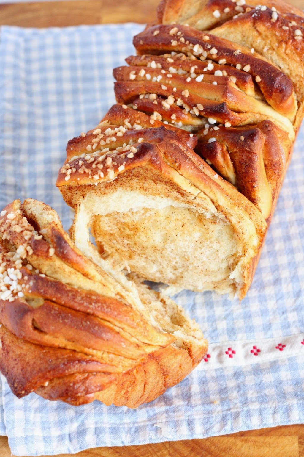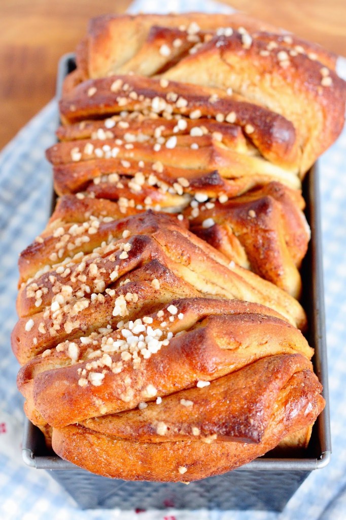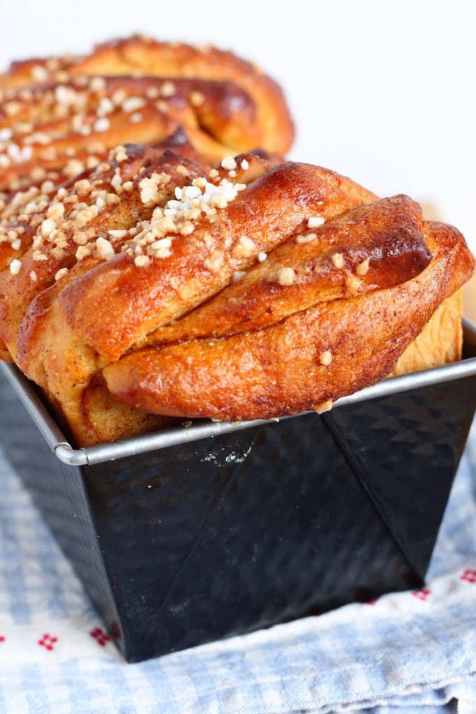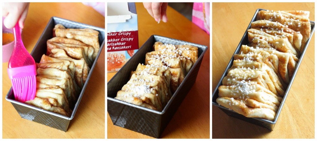 Pullasta tuli vähän hassun näkönen, sillä itselläni ei ollut tarpeeksi suurta vuokaa ja taikina alkoi pursua uunissa ulos vuoasta. Toisaalta tarviiko nyhtöpullan niin nätti ollakkaan, siitähän revitään muutenkin palasia, joten rosoisempi ulkonäkö sopii tilanteeseen hyvin 😉