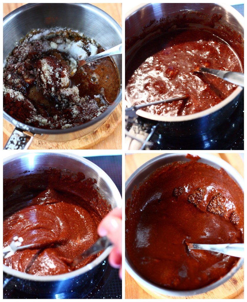 Sulata voi paksupohjaisessa kattilassa. Lisää sekaan siirappi, sokeri, mantelijauhe ja kaakaojauhe (ylin kuva vasemmalla). Keitä seosta miedolla lämmöllä n. 25-30 min. koko ajan sekoittaen. Massa paksunee pikku hiljaa ja samalla kiehumiskuplat häviävät (toinen kuva otettu hieman paksenneesta, n. 104 asteisesta massasta ja kolmas kuva melkein valmiista). Massa on valmista kun se alkaa irrota kattilan reunoilta ja kattilan pohjalta, kun kattilaa kallistaa (kuva alhaalla oikealla). Jos käytät lämpömittaria, on massa valmista kun mittari näyttää 125 astetta.