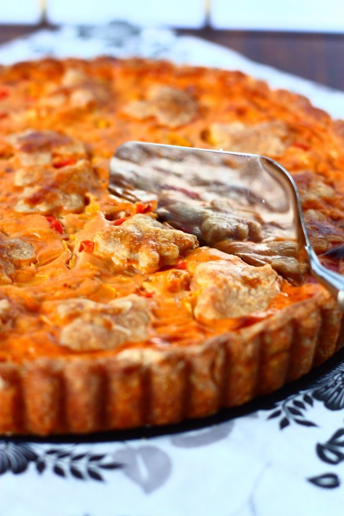 Tässä yksi suolainen piirakka, joka on jäänyt jalkoihin muiden ajankohtaisen reseptien takia. Piirakka on silti aivan pakko julkaista, sillä tämä oli tosi hyvää! Täytteen tein muokkaamalla erästä lempparibroilerikastikettani hieman paksummaksi. Piirakkamuotoinen ”kastike” toimi niin hyvin, että ihmettele miksei aikaisemmin ole tullut mieleen tehdä vastaavaa. Tässä miedosti tomaattisessa piirakassa maistui broilerin lisäksi paprika ja aurajuusto, nami nami! 🙂