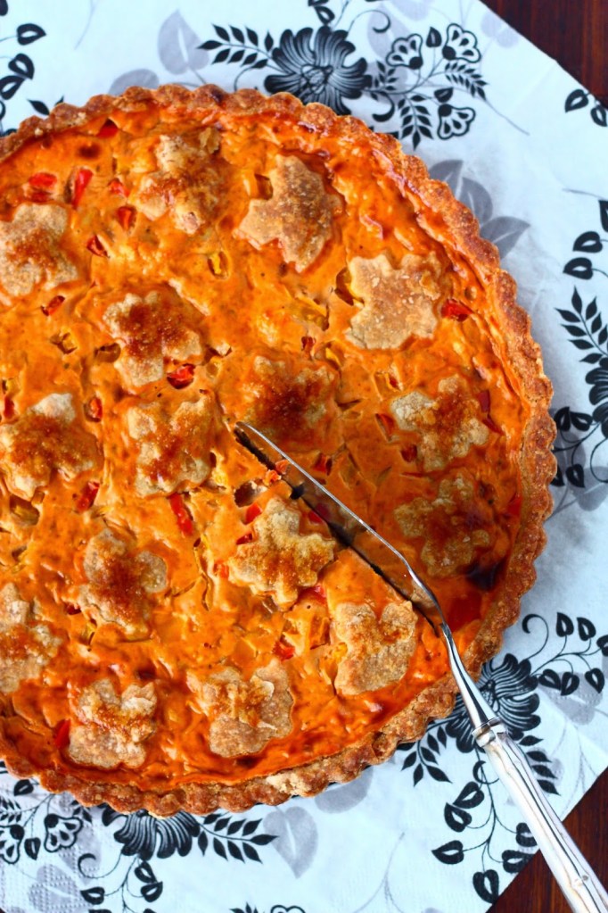 Tytär auttoi piirakan teossa ja koristeli pyöreän piirakan ottamalla muotilla ylijääneestä taikinasta lehden mallisia palasia. On tosi kiva huomata, että tyttö on vähintään yhtä innostunut leipomisesta kuin äitinsäkin. Tytön kiinnostus keskittyy ehkä hieman enemmän koristelupuolelle, kun taas itse yritän saada maut kohdilleen. Kumpaakin tarvitaan ja yhdessä tämä onkin aika toimiva yhdistelmä 🙂