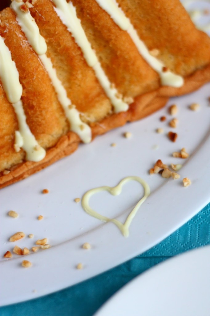 Koristelin kakun valkosuklaalla, jossa oli hieman öljyä joukossa. Öljy tekee suklaasta hieman pehmeämpää, eikä se lohkeile leikattaessa niin helposti kuin ilman öljyä.  Liruttelin valkosuklaasta myös sydämiä lautasen reunoille.. Reilusti sitruunalla maustettu porkkanakakusta tuttu tuorejuustokuorrutekin olisi sopinut tähän tosi kivasti. Toki makeutta olisi tullut lisää, mutta sitruunalla olisi saanut myös lisämakua ja hitusen sitruunaista raikkauttakin.