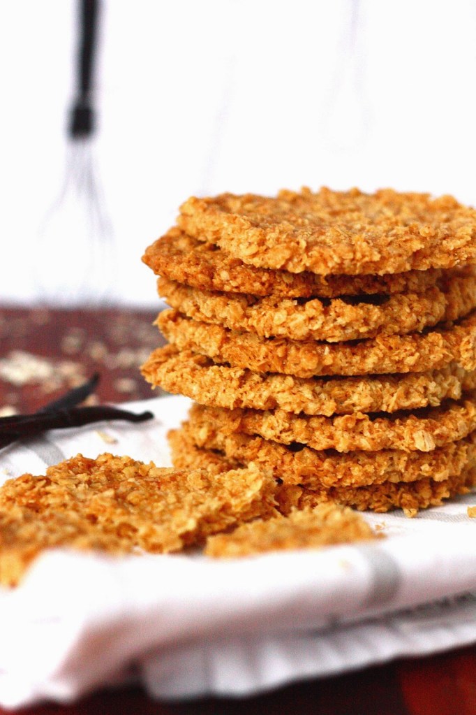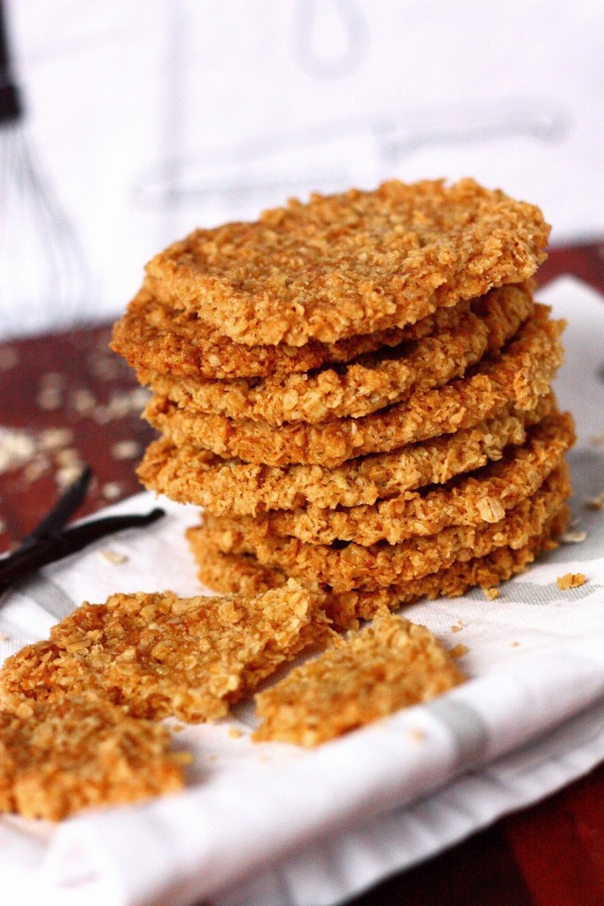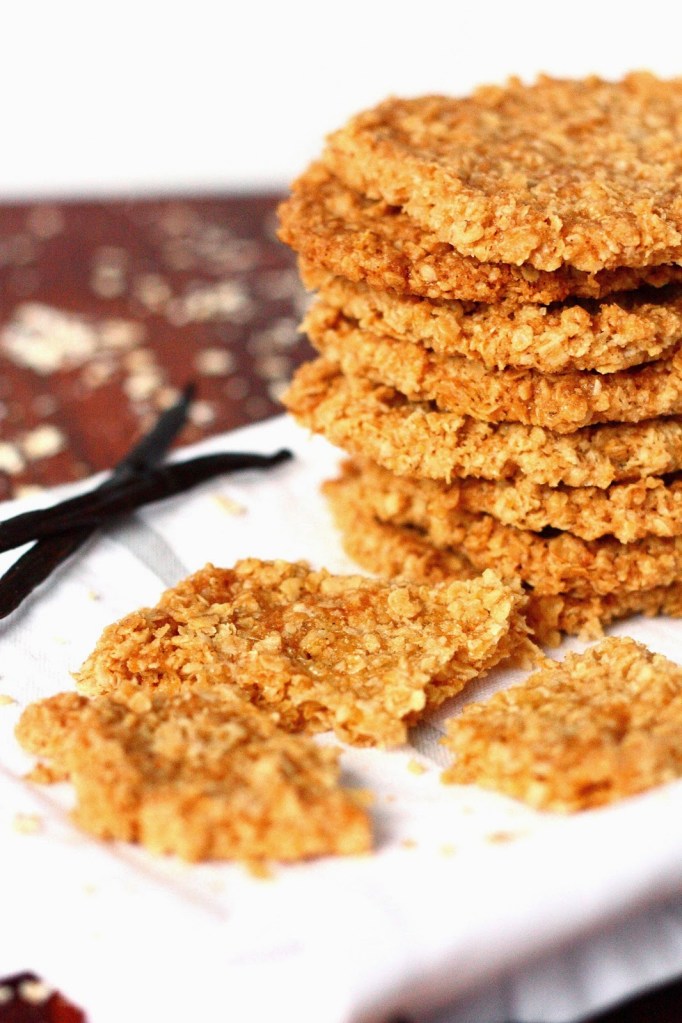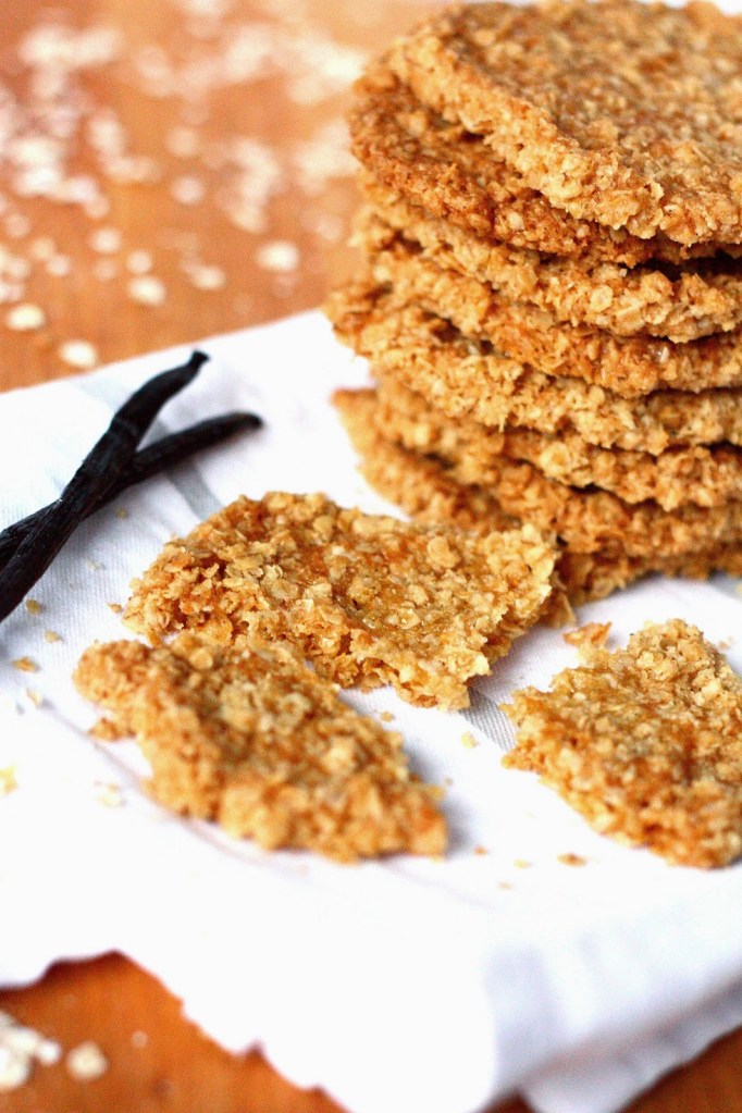 Aineet: 100g voita huoneenlämpöisenä 1 dl sokeria 1 tl vaniljapastaa 1 rkl vehnäjauhoja 1/2 tl leivinjauhetta 1/2 tl soodaa 1/3 tl suolaa 3.5 dl kaurahiutaleita