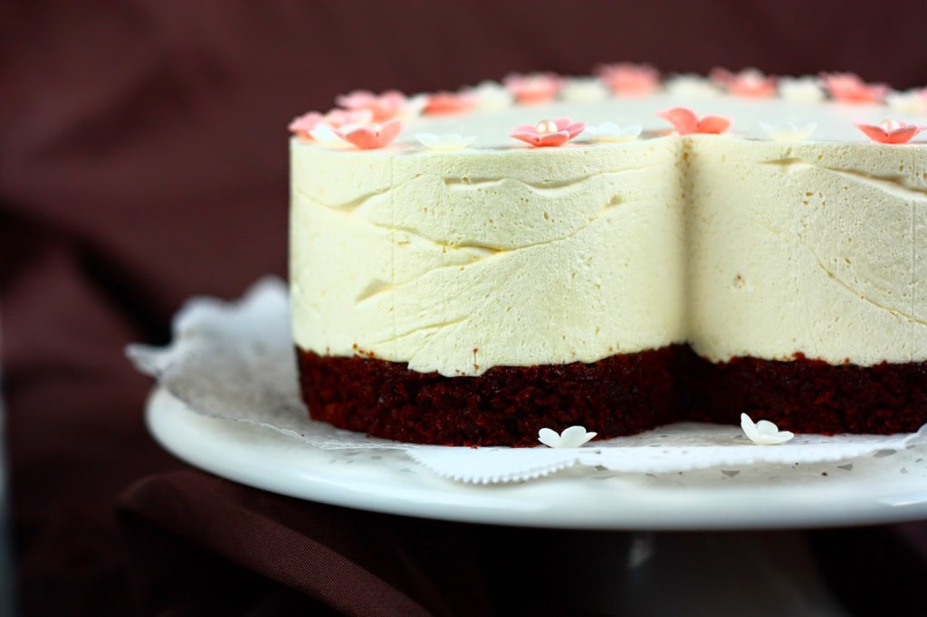 Kakun reunoille tuli ylimääräinen kauneusvirhe. Voitelin tuon reunan sisäpuolen ennen täyttämistä, sillä voitelu helpottaa reunavuoan poistamista. Kun nostin reunan pois, se liukui nätisti ylös, mutta otti hieman murusia mukaan ja suttasi kakun reunat. Koristelun hoidin helposti ja nopeasti valmiiksi tehdyillä kukkasilla. Yksinkertaista, mutta ainakin äitini piti lopputuloksesta. Sekä maun että ulkonäön suhteen.