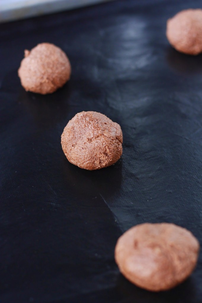 Kokeilin keksien tekemistä samantein kahdella eri tavalla. Toiselle pellille pyörittelin taikinasta palloja ja paistoin ne sellaisenaan. Keksit jäivät mukavan kosteiksi ja aivan mahdottoman suussa sulaviksi. Ja siis ihan sananmukaisesti, ne suorastaan sulivat suuhun ja suklaan maku sujahti suoraan kielen pintaan, jami!