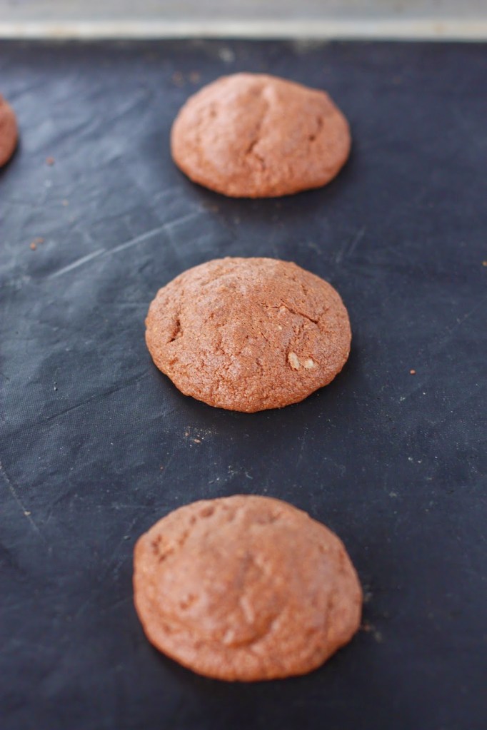 Paista 160 asteessa n. 10 minuuttia. Keksit ovat tässä vaiheessa vielä raa’an oloisia, tosi tosi pehmeitä, reunoilta juuri ja juuri laskeutuneet, mutta keskeltä vielä koholla.