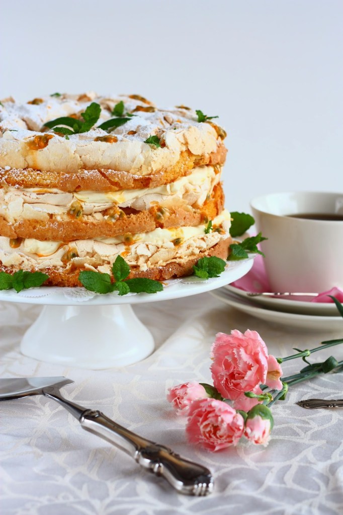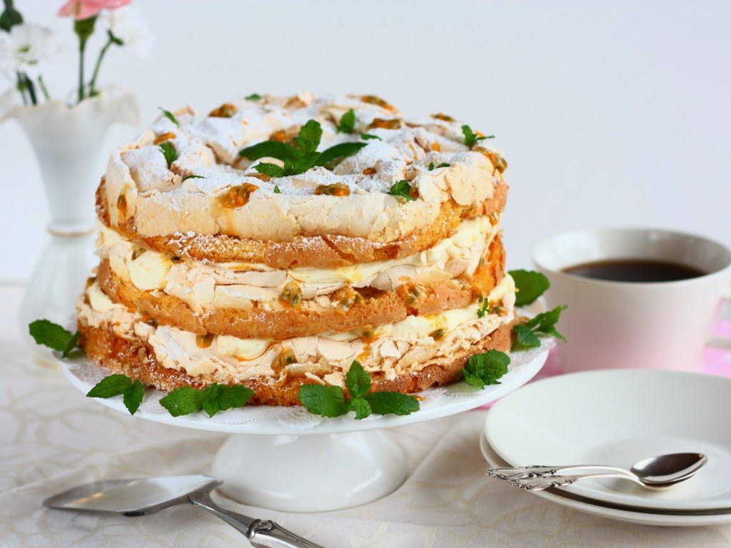 Nosta päälle vielä viimeinen pohjapala. Koristele tomusokerilla, passionhedelmän siemenillä ja mintun lehdillä.