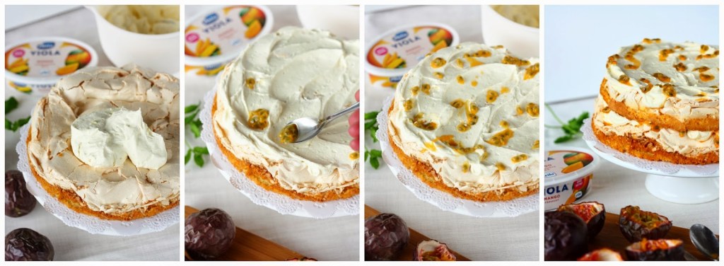Nosta alin pohja tarjoilulautaselle. Levitä täytteestä noin puolet alimman pohjan päälle. Halkaise passionhedelmä ja lusikoi hedelmälihaa täytteen päälle. Nosta toinen pohjapala päälle. Levitä loput täytteestä ja lusikoi pinnalle lisää passionhedelmää.