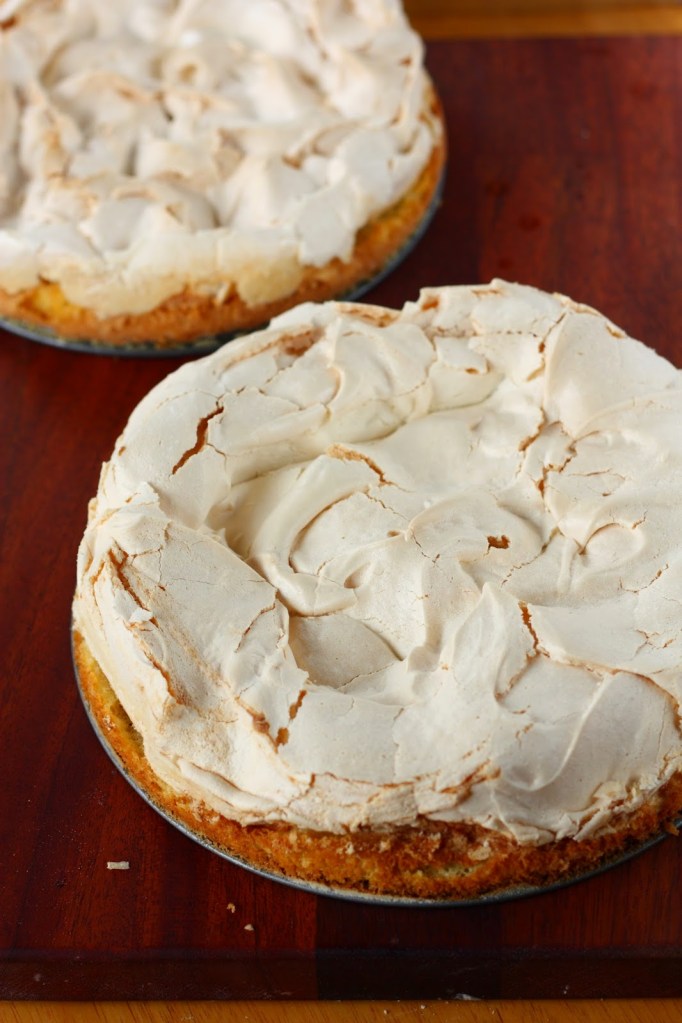 Voitele hyvin kolme n. 21 cm irtopohjavuokaa ja jauhota esimerkiksi vehnäjauhoilla. Jaa pohjataikina vuokiin ja levitä tasaiseksi kerrokseksi vuokien pohjalle. Taikinaa ei tarvitse levittää aivan reunoihin asti, sillä taikina kyllä leviää uunissa. Laita vuoat syrjään odottamaan. Valmista marenki. Vaahdota valkuaisia. Kun valkuaiset alkavat vaahdota, lisää sokeria 1 rkl kerrallaan valkuaisvaahdon joukkoon koko ajan voimakkaasti vatkaten. Vatkaa kunnes vaahto on paksua ja kiiltävää. Levitä valkuaisvaahto pohjataikinoiden päälle.