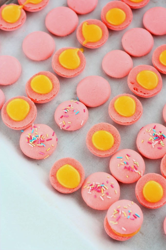 Kuoret: yhteensä 3 annosta macaron-kuoria, osa italialaisella ohjeella, osa Jennin ohjeella – yhteen annokseen keltaista pastaväriä – toiseen annokseen punaista pastaväriä + strösseleitä pursotettujen lanttien päälle – kolmanteen annokseen vihreää pastaväriä + tummaa kaakaojauhetta pinnalle koristeeksi pursotuksen jälkeen