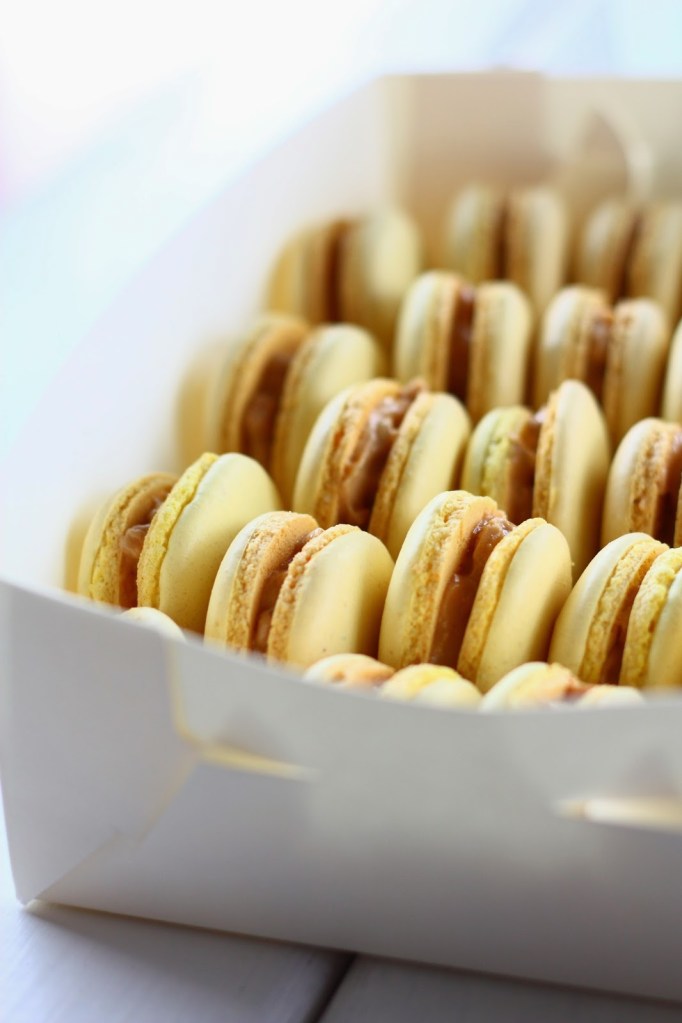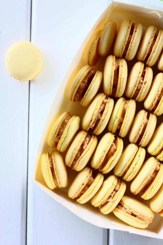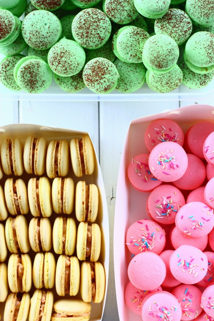 Maapähkinävoi-, sitruuna- ja piparminttu-suklaa-macaronit-leivokset Koosta riippuen n. 90 kpl valmista macaron-leivosta