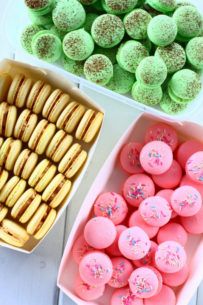 Sain pyynnön tehdä Vapuksi kunnon pläjäyksen erilaisia macaron-leivoksia. Täytteiden ja värien suhteen sain vapaat kädet. Vappuun (ja miksei muihinkin juhliin) sopii hyvin erilaiset värit, joten tein niin väri- kuin makumaailmaltaan kolmenlaisia leivoksia.