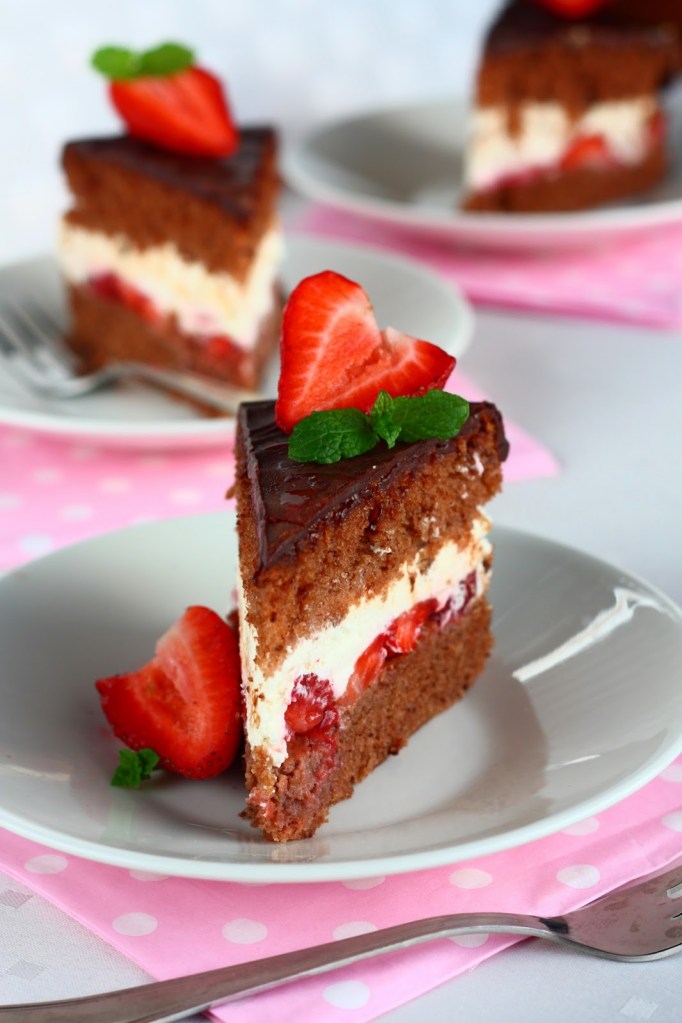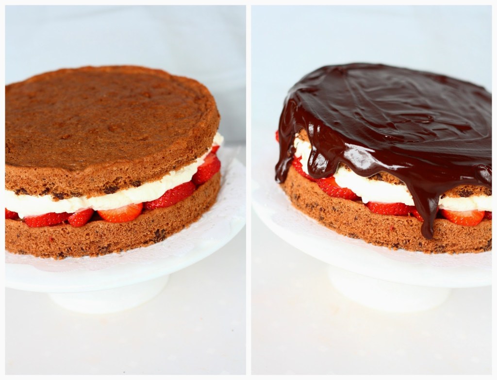 Suklainen kakkupohja päätyi mansikka-suklaakakkuun. Väliin tuli tuoreita mansikoita tuorejuustokermavaahdolla ja päälle vielä kerros suklaaganachea mansikoilla. Kuullostaa hyvältä? Sellaista se olikin 🙂
