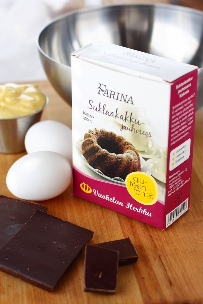 Olen iloinen, että sain Blogiringin kautta mahdollisuuden tutustua Vuohelan Herkun Farina Suklaakakkujauhoseokseen. Jauhoseoksesta tehty suklaakakkupohja onnistui yli odotusten. Se oli niin mehevä, ettei kaivannut lainkaan kostutusta. Koostumus oli ihanan pehmeä ja suussa sulava. Usein gluteenittomat kakkupohjat ovat helposti niin höttöisiä, etteivät kestä välttämättä siirtämistä hajoamatta sen tuhanneksi muruseksi. Tämä pohja kuitenkin kesti pehmeydestään huolimatta nostamiset ja siirrot hienosti hajoamatta. Kakkupohjan maku oli miedon suklainen.